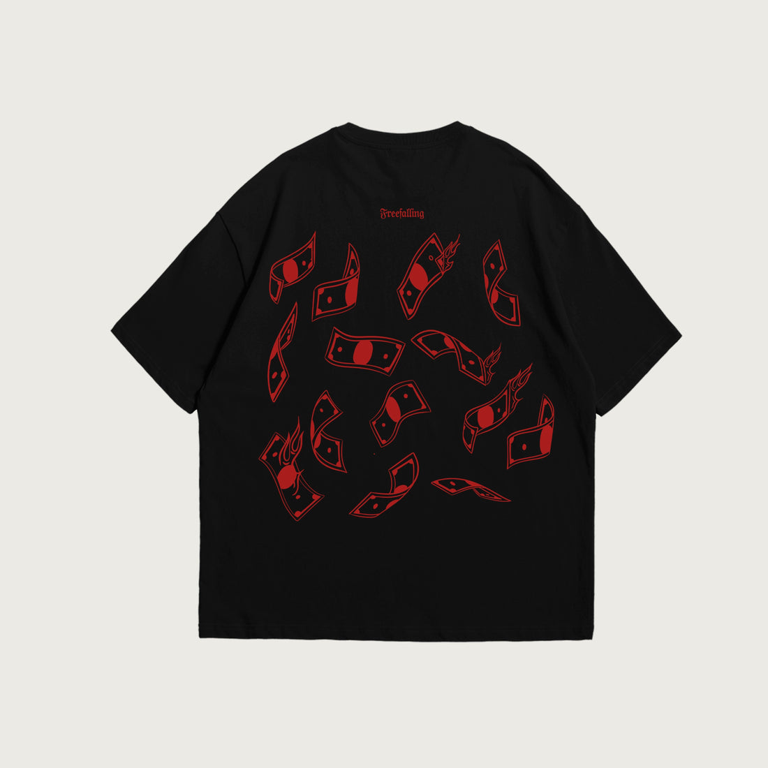 Introducing the "Cash Cascade Tee". On the front, revel in a captivating scene of packed...