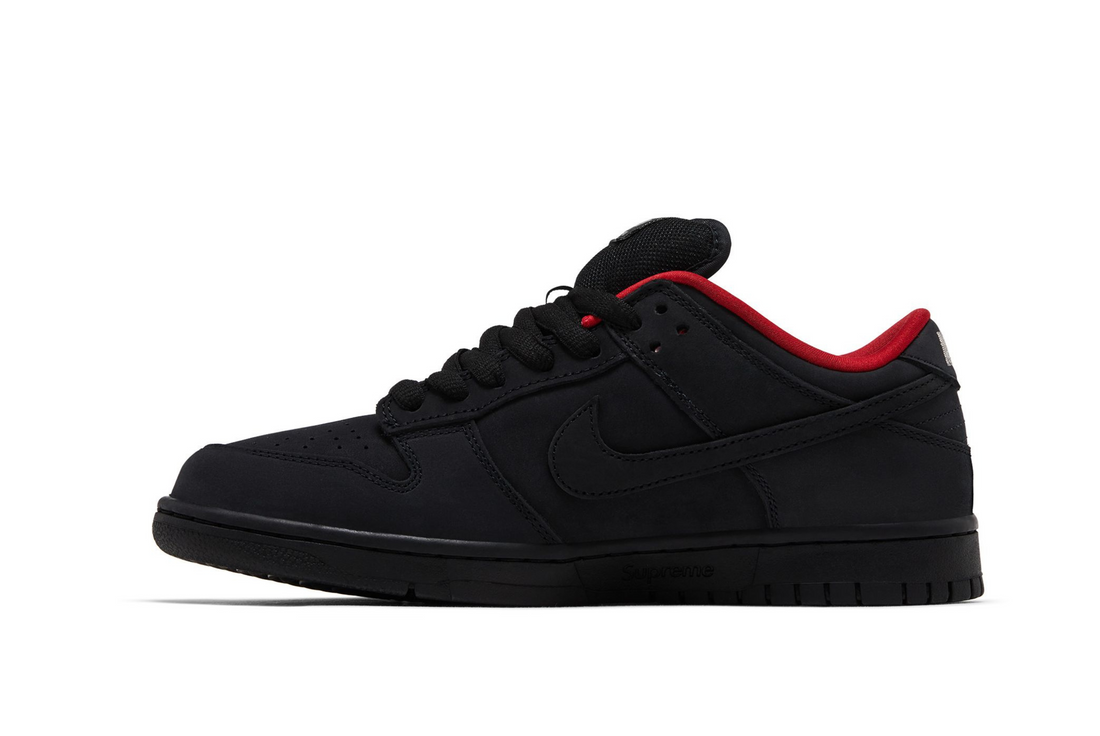 The Supreme x Nike Dunk Low SB 'Black' reunites the partner brands on a stealthy...