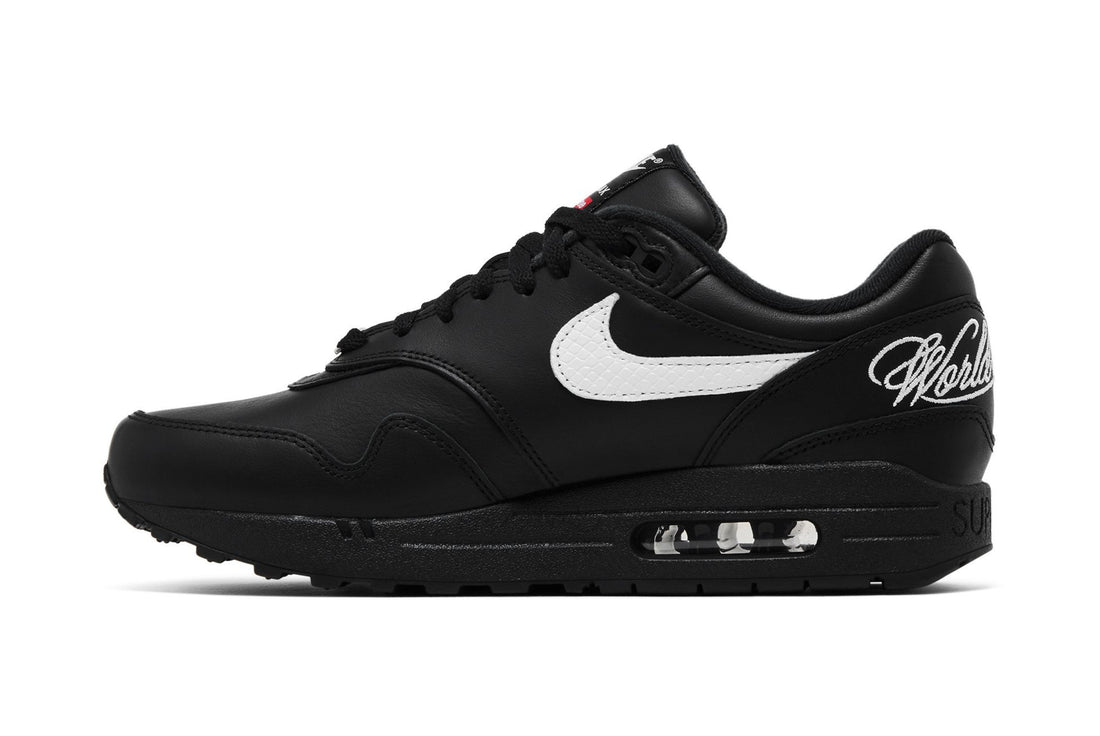 The Supreme x Nike Air Max 1 '87 SP 'Black White' delivers layered black leather...