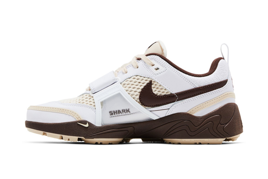 The Travis Scott x Nike Zoom Field Jaxx 'Light Chocolate' features a cream-colored mesh upper...