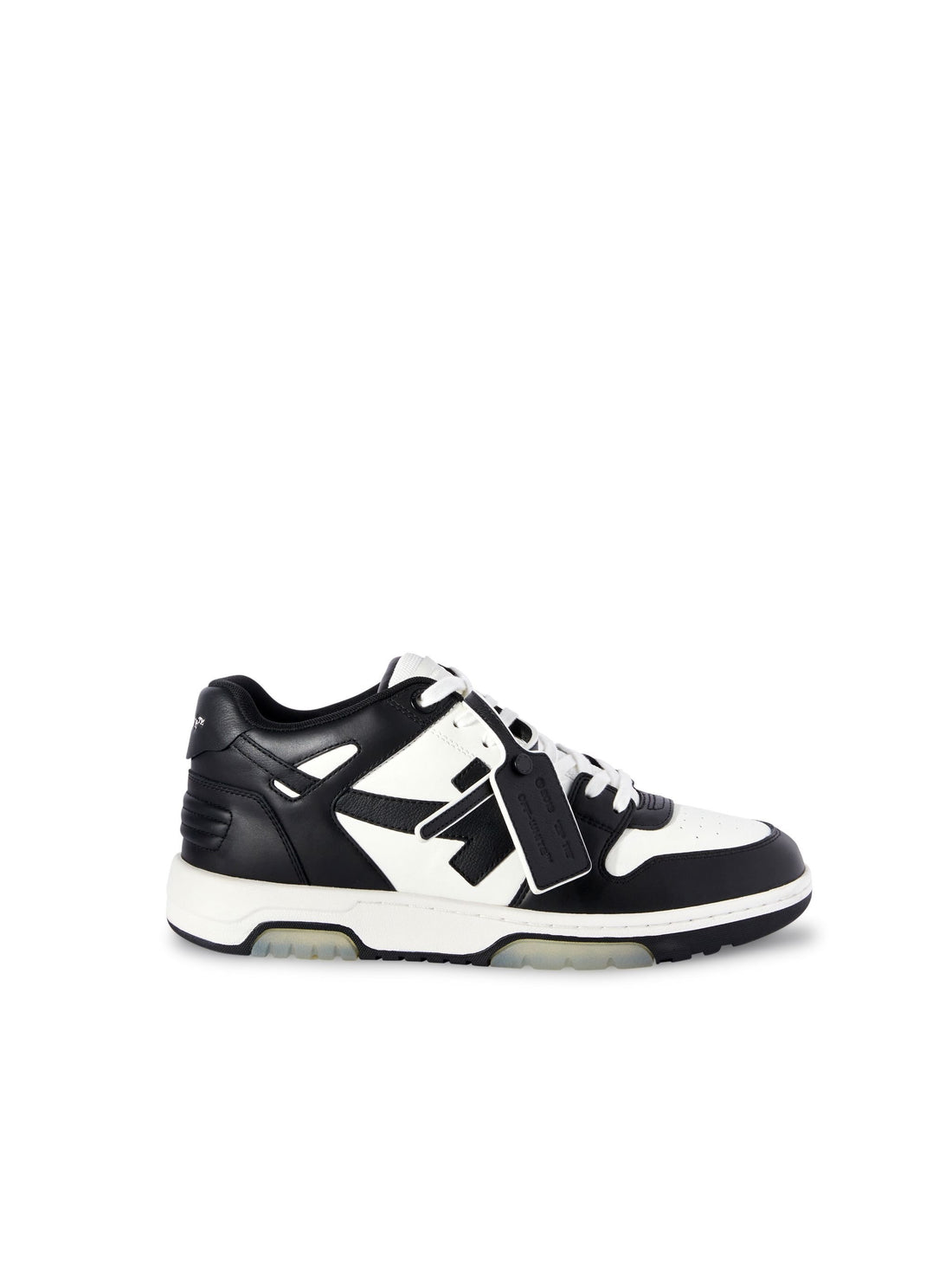 Black low Out Of Office sneakers featuring white arrows at sides. Black and white label...