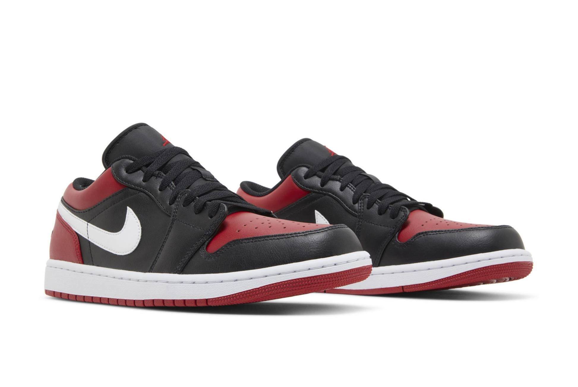 The Air Jordan 1 Low 'Alternate Bred Toe' features a full-leather upper, with black and red panels and a white Swoosh. The toe box and heel area features Gym Red hits, along with a small Jumpman on the tongue. The classic Wings logo is embroidered in black on the back heel, finishing the look.