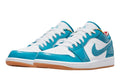 Buy Air Jordan 1 Low 'Barcelona in India from copyourdrip.com , The Air Jordan 1 Low SE Barcelona Cyber Teal upper features a smooth white leather base with light teal patent leather overlays. The signature Jordan Wing insignia is stitched on the heel counter, and the insole linin(GS) for grade schoolers come in colorful mismatched triangular mosaic patterns. The Signature Swoosh logos appear on the sides in white. Underfoot, a white midsole and gum outsole rounds off the look.