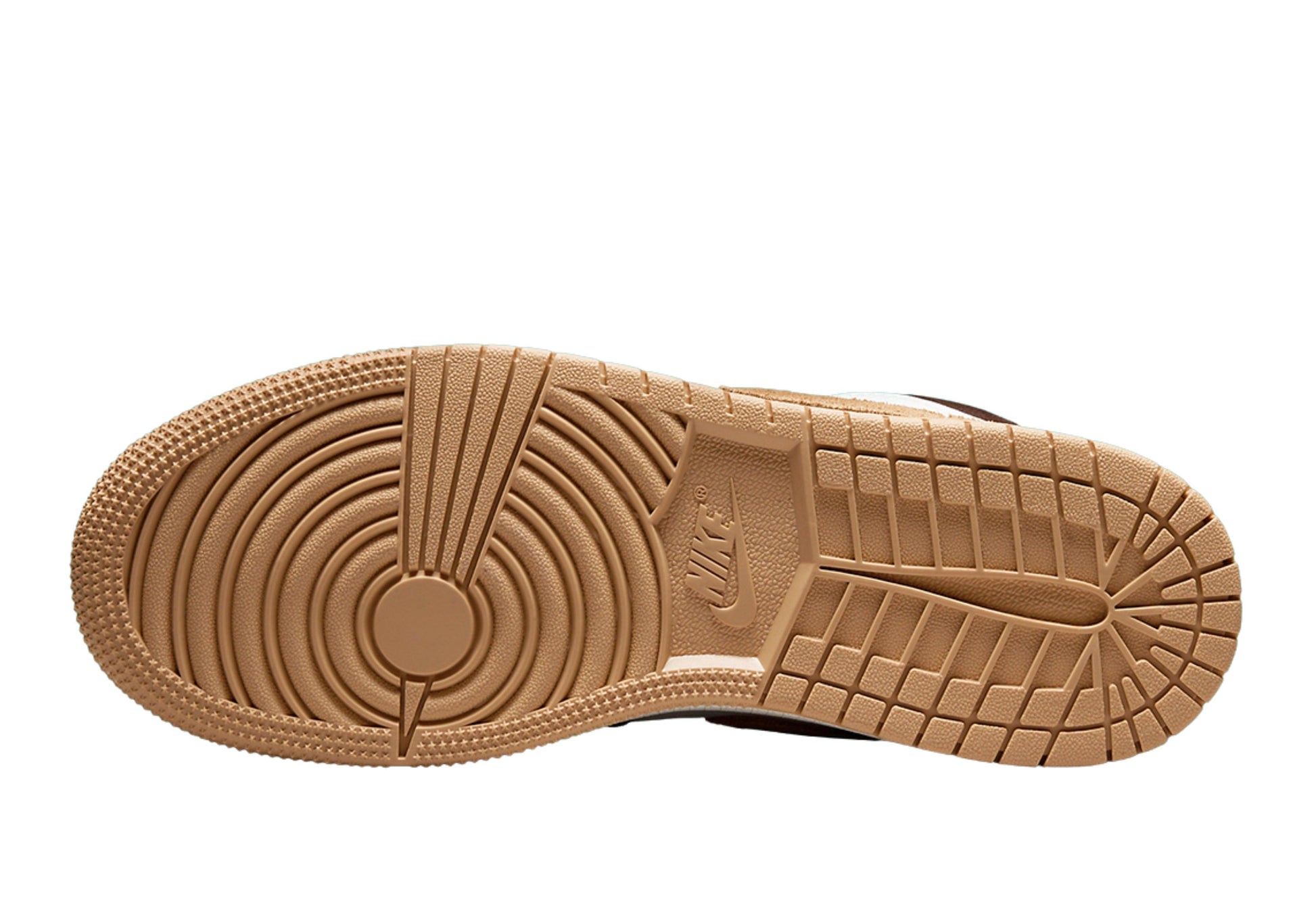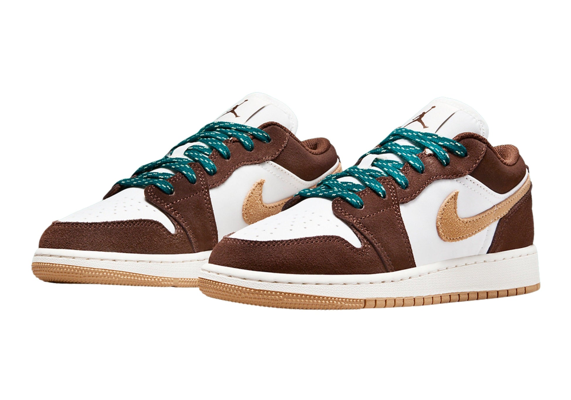 Buy Air Jordan 1 Low GS 'Cacao Wow' in India from copyourdrip.com , Built for big kids, the Air Jordan 1 Low GS ‘Cacao Wow’ dresses the classic silhouette in a color palette drawn from the natural world. Speckled teal laces secure the upper, crafted from white leather with a beige suede Swoosh and brown suede overlays at the forefoot and heel. Jumpman branding appears on the tongue, while the iconic Wings logo graces the back heel. The low-top rests on a rubber cupsole that pairs vintage off-white sidewalls with a tan rubber outsole.