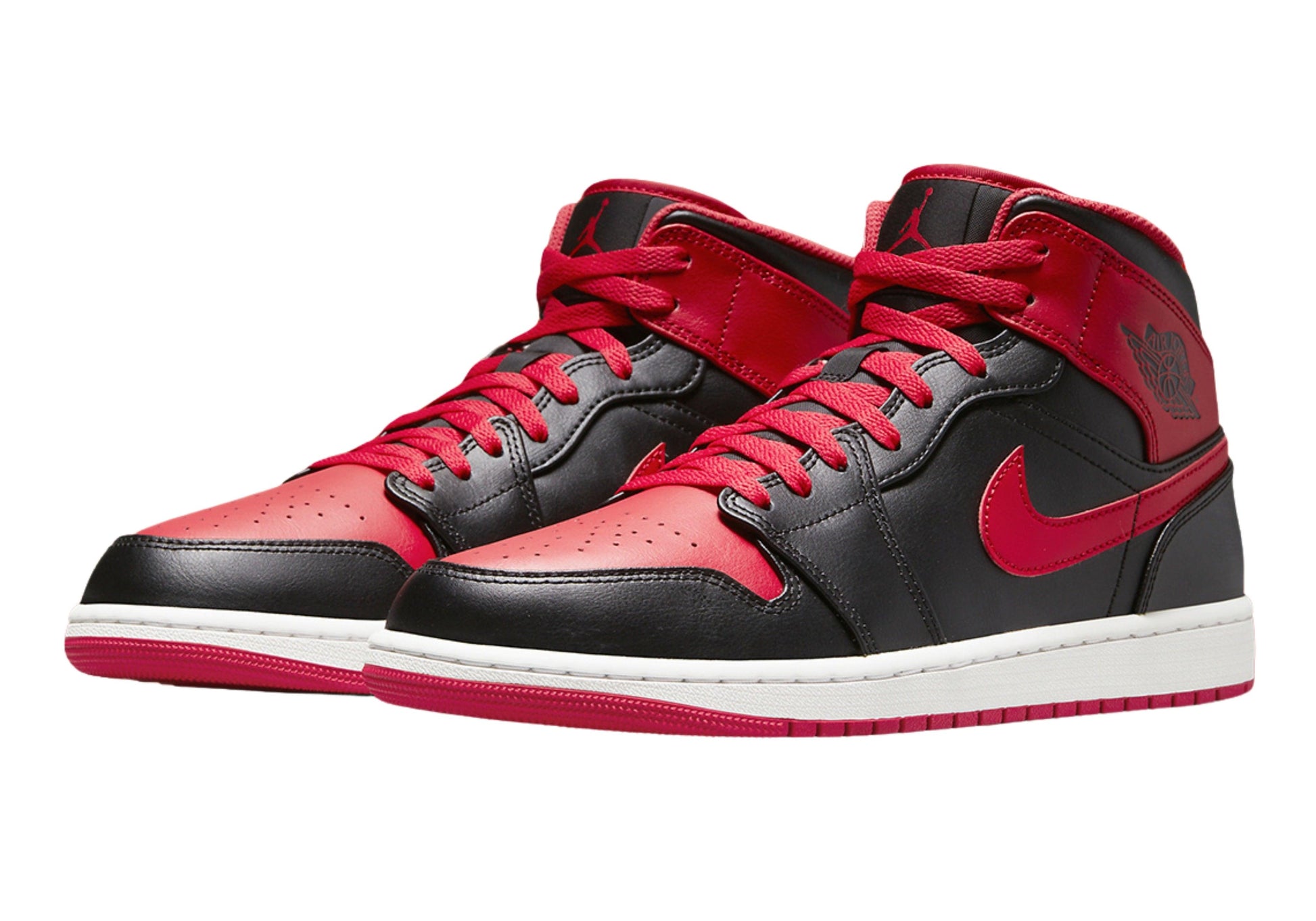 Buy Air Jordan 1 Mid 'Alternate Bred' in India from copyourdrip.com , Near identical to the “Banned” counterpart that released back in 2020, the updated “Bred” proposition sees the midfoot, mudguard and upper base layers render a pitch-black tone whereas the smooth leather vamp, Swoosh and collar overlay proffer the synonymous Red hue. The titular shade is picked up once again throughout the sock liner, laces and tread underfoot before the darkened tone returns for the winged ankle insignia and nylon tongue tab. Complimenting the reconfigured build, a clad white midsole interjects, providing a brightened accent in conclusion.