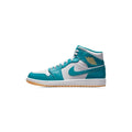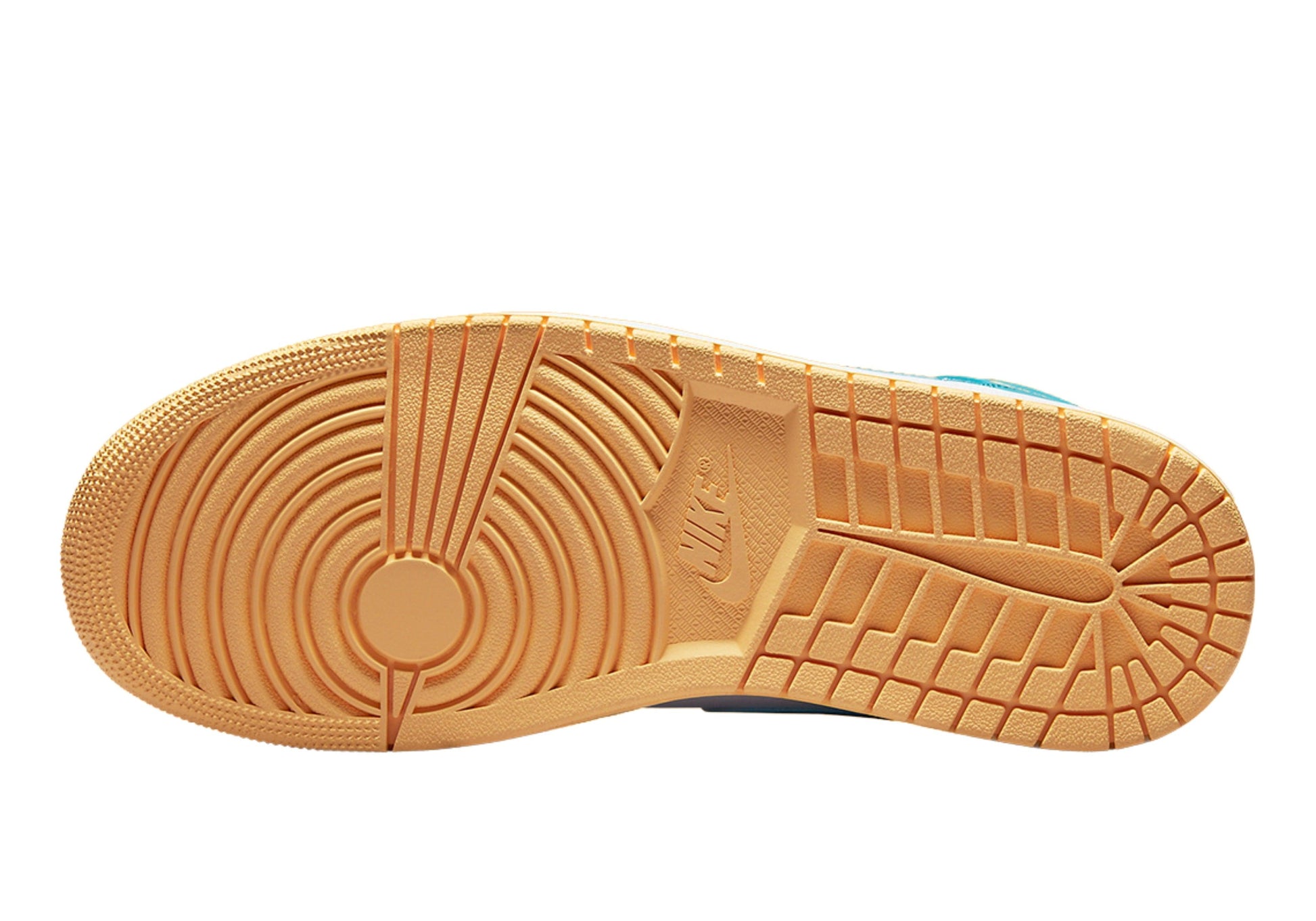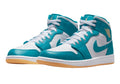 Buy Air Jordan 1 Mid 'Aquatone' in India from copyourdrip.com , Centered on its typical two-toned color blocking throughout the pair’s smooth leather upper, “Aqua” blue overlays pair effortlessly with a crisp white base layer. Further indulging the bright blue hue along its sock liner, tongue tabs and midfoot Swooshes, seldom shades of “Peach” begin their inclusion along the both the insoles latter tabs insignias before laying claim to the tread in clad fashion.