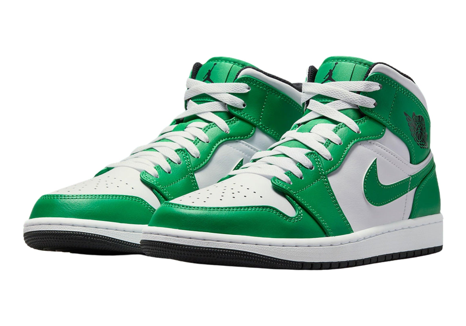 Buy Air Jordan 1 Mid 'Lucky Green' in India from copyourdrip.com , The Air Jordan 1 Mid ‘Lucky Green’ applies classic two-tone color blocking to a timeless silhouette modeled after Peter Moore’s original 1985 design. The leather upper combines a crisp white base with emerald overlays and a color-matched Swoosh. A Jumpman icon adorns the woven tongue tag, while a retro Wings logo is stamped in black on the lateral collar flap. The mid-top rides on a textured white midsole, fitted with encapsulated Air-sole cushioning and supported by a black rubber outsole.