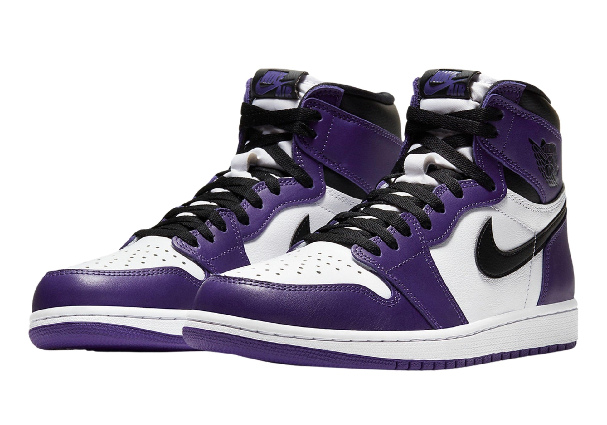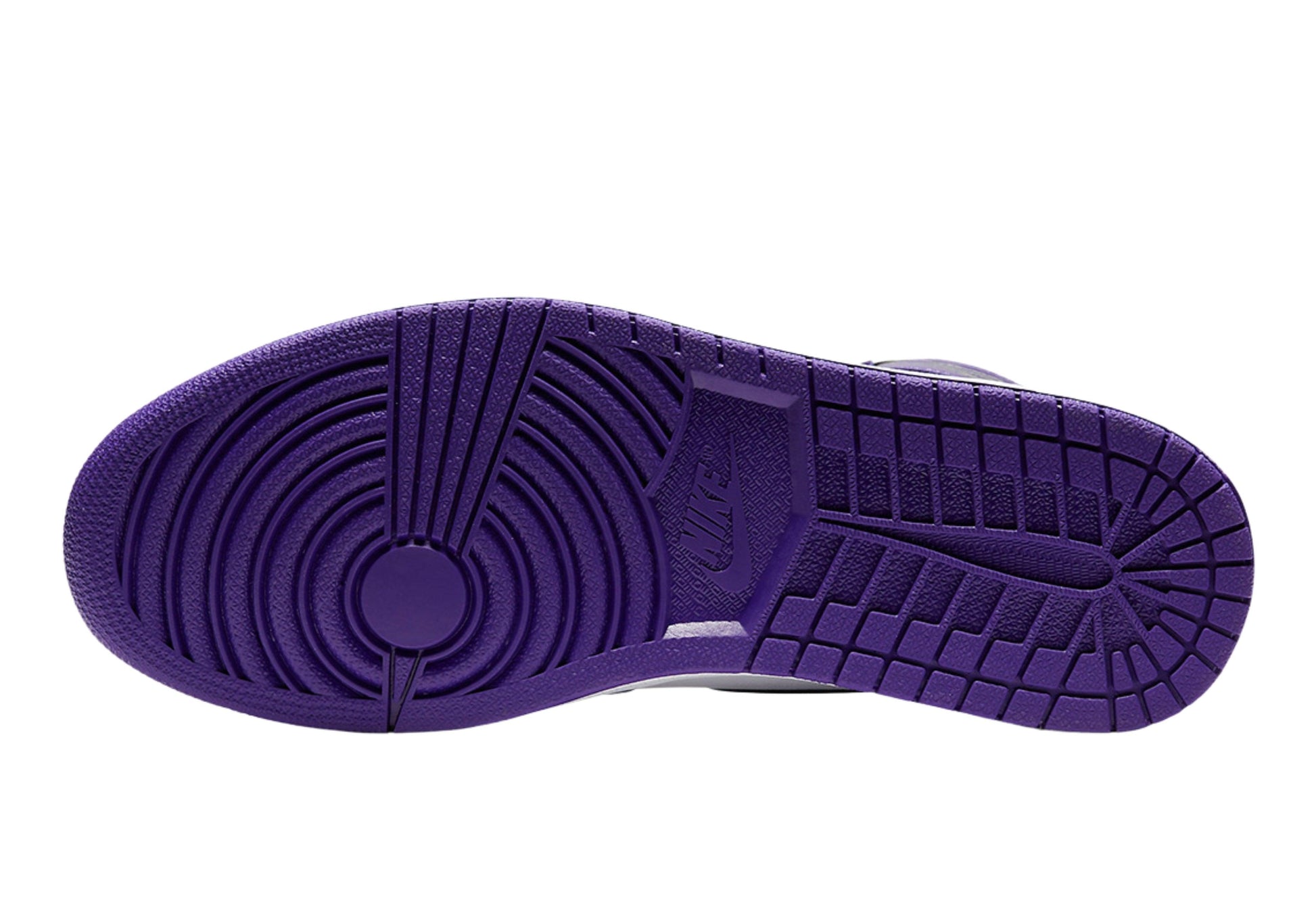 The Air Jordan 1 Retro High OG ‘Court Purple’ features an all-leather build, executed with the same color-blocking seen on AJ1 models like the ‘Shattered Backboard’ and ‘Bred Toe.’ Here, the toe box, heel and wings are finished in Court Purple, while a crisp white quarter panel is overlaid with a contrasting black Swoosh. The shoe earns its ‘OG’ designation through the purple Nike tag on the black nylon tongue.