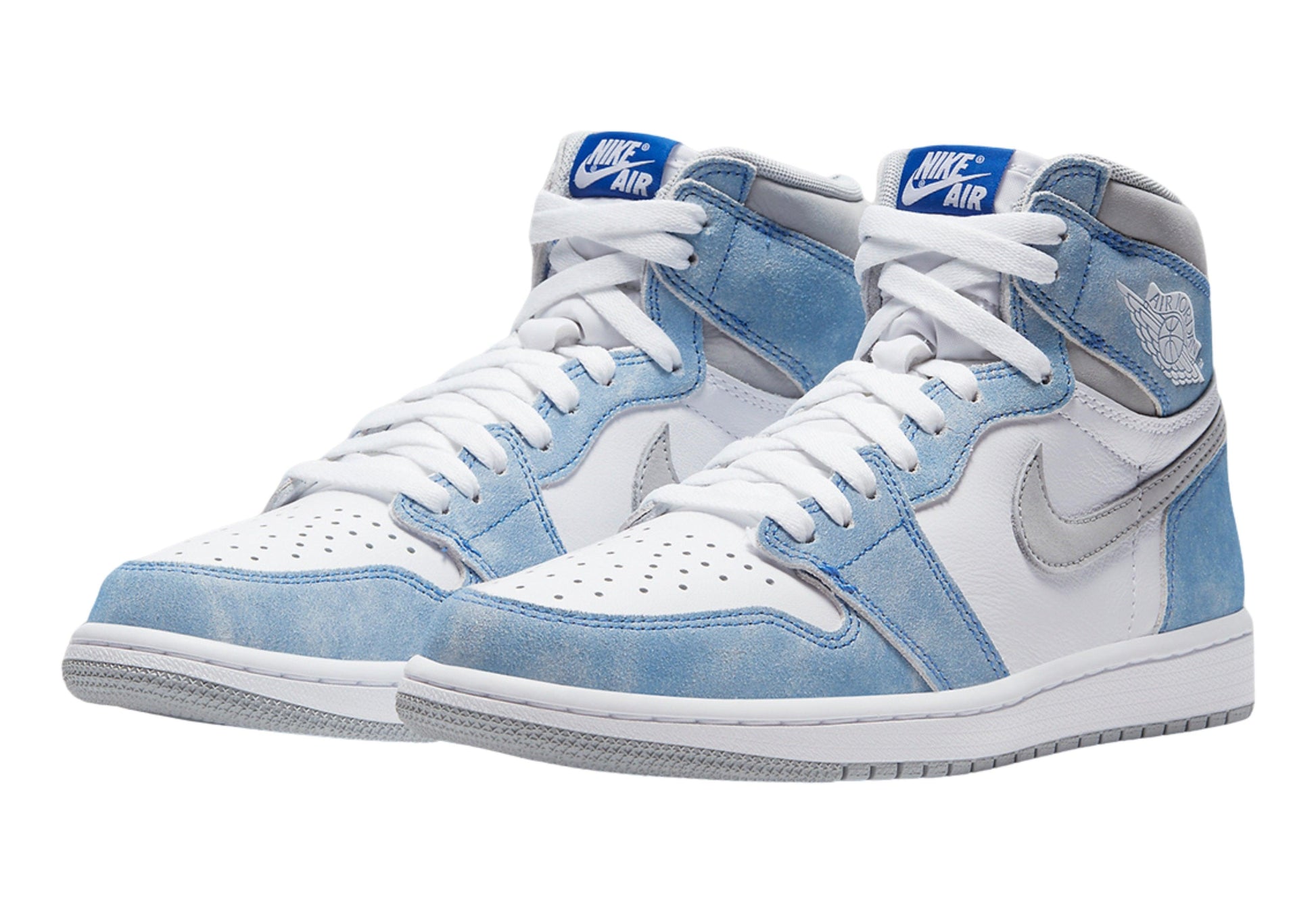 The Air Jordan 1 Retro High OG ‘Hyper Royal’ takes on a weathered aesthetic, highlighted by a white leather upper with faded blue suede overlays. Contrasting neutral grey hits land on the Swoosh and padded collar, adding to the sneaker’s understated palette. OG branding elements include a Jordan Wings logo on the lateral collar flap and a woven Nike tongue tag. The high-top is mounted on a standard AJ1 rubber cupsole, featuring encapsulated Nike Air cushioning in the heel.