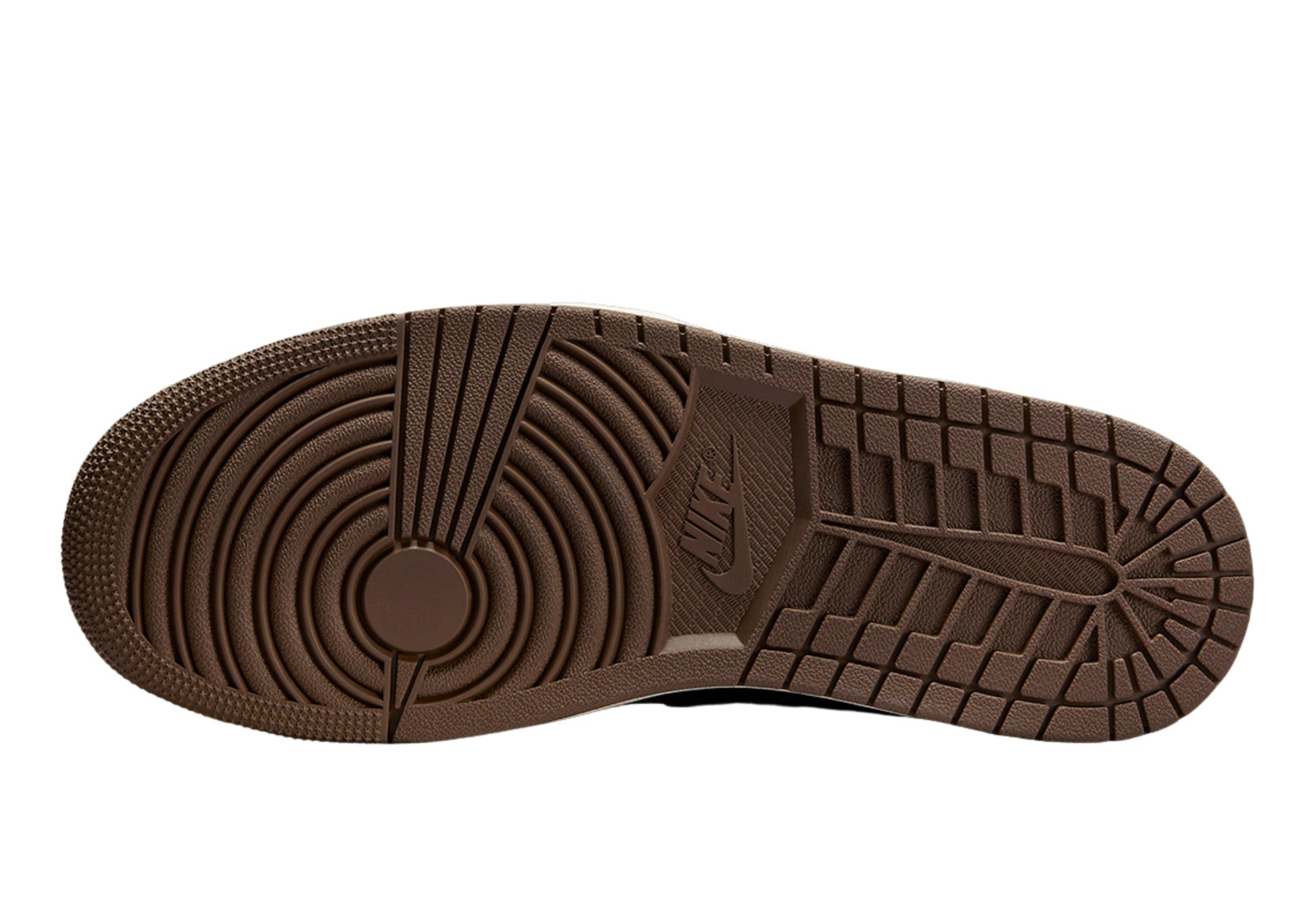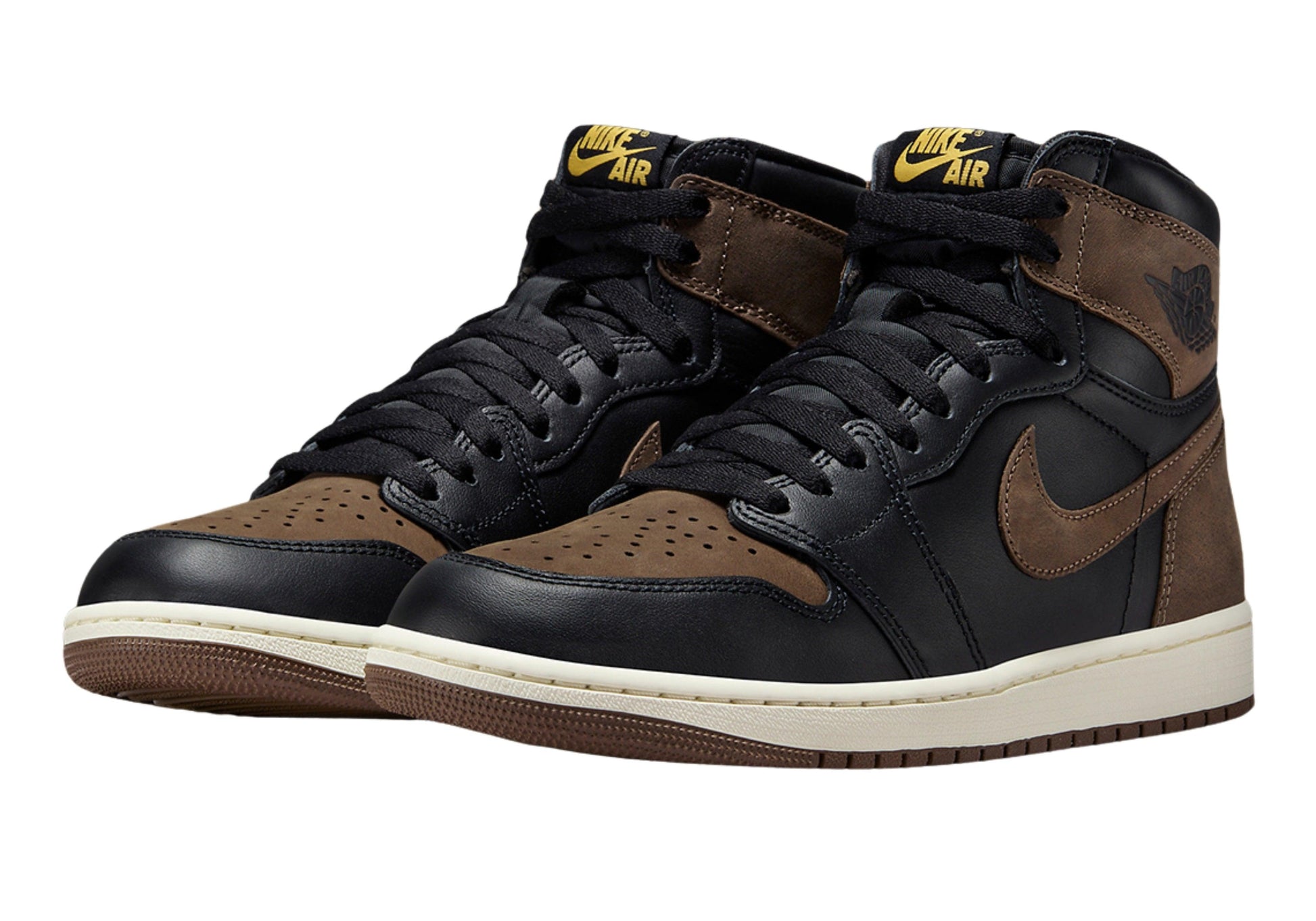 The Air Jordan 1 Retro High OG ‘Palomino’ merges a luxe build with OG-inspired two-tone color blocking. The sneaker icon carries a black leather upper, accented with aged brown nubuck on the toe box, Swoosh, heel overlay and collar flap. The latter is marked with a black Wings logo on the lateral side, while the woven tongue tag displays a Nike logo with metallic gold lettering. A contrasting off-white finish is applied to the midsole, built with stitched sidewall construction and encapsulated Air-sole cushioning. Underfoot, a brown rubber outsole features a traction pattern designed to grip the hardwood.