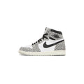 The Air Jordan 1 Retro High OG ‘White Cement’ showcases the signature design feature of the Air Jordan 3: namely, Tinker Hatfield’s unique elephant print, composed of irregular lines etched throughout the high-top’s grey leather overlays. They’re contrasted by a white leather base and black leather construction on the high-cut collar and Swoosh. Additional branding elements take the form of a woven Nike Air tongue tag and a Wings logo stamped on the lateral collar flap. Encapsulated Air-sole cushioning enhances the aged off-white midsole, supported underfoot by a grey rubber outsole.