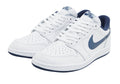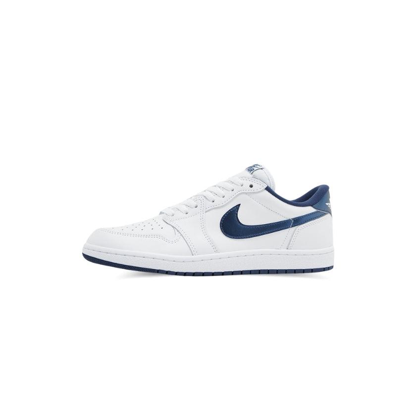 Buy Air Jordan 1 Retro Low '85 OG 'Metallic Blue' 2024 in India from copyourdrip.com, The 2024 reissue of the Air Jordan 1 Retro Low '85 OG 'Metallic Blue' revives an original colorway of the timeless silhouette. The low-top utilizes a clean white leather upper, contrasted by metallic navy detailing on the Swoosh and back tab. The latter is marked with a printed Wings logo, while a woven Nike Air tag graces the breathable nylon tongue. An encapsulated Air-sole unit, contained in the heel of the rubber cupsole, provides lightweight cushioning.