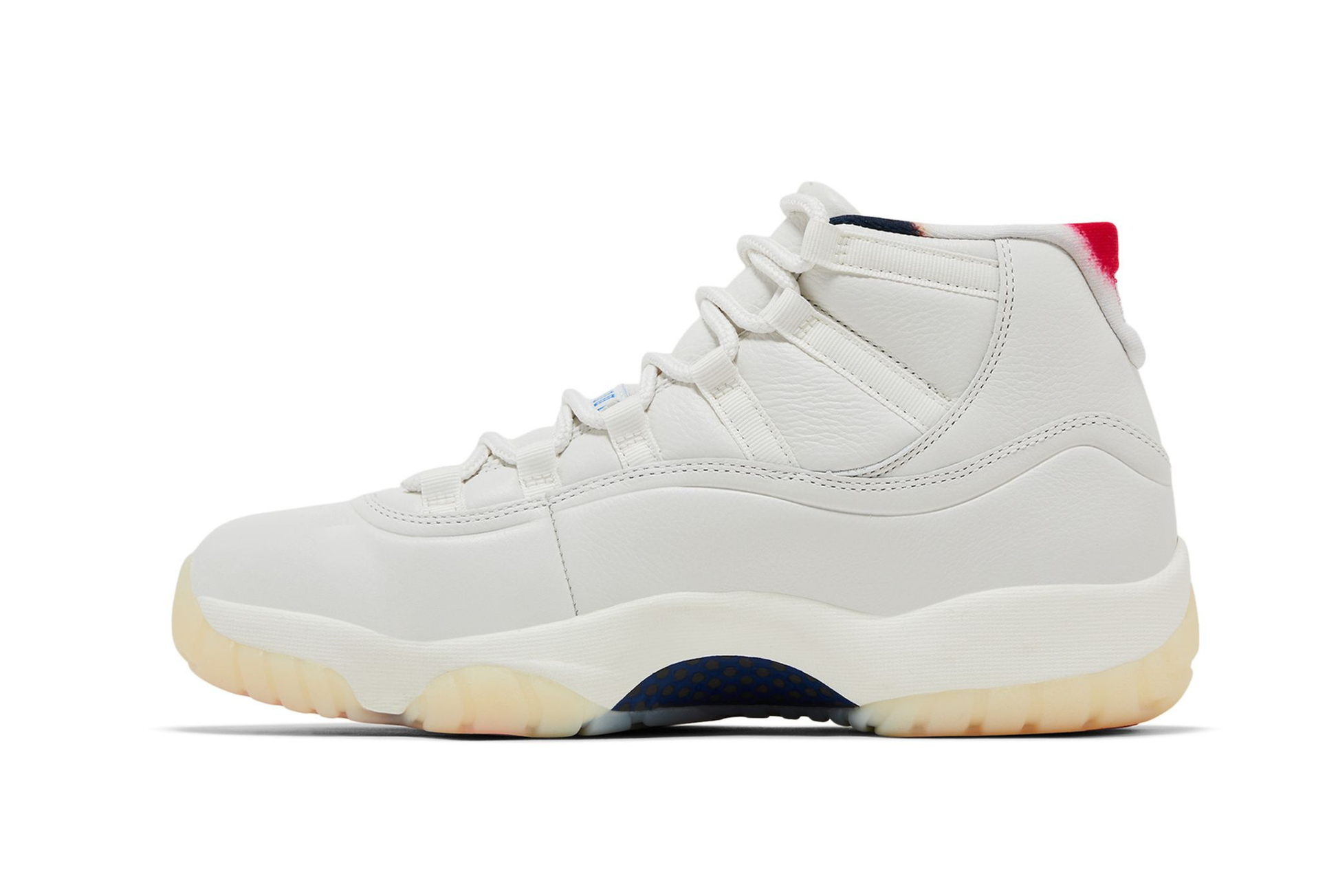Launching as part of the 'City Pack,' the Air Jordan 11 Retro '285' celebrates the city of Atlanta, with a name referencing the interstate highway that encircles the Georgian capital. Tumbled white leather is utilized on the upper, secured with rope laces that feed through tonal webbing eyelets. A debossed Jumpman adorns the lateral collar, while a stylized '23' graces a textile back tab finished in a blend of green, red and blue. The gradient design continues on the collar lining. Underfoot, the semi-translucent rubber outsole features herringbone traction pods in a contrasting crimson hue.