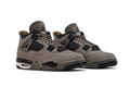 The Air Jordan 4 Retro 'Cave Stone' showcases a dark taupe hue on the smooth nubuck upper, featuring contrasting black accents on the quarter panel netting, molded eyelets, and textile collar lining. A Jumpman icon adorns the woven Flight tongue tag, while Nike Air branding graces the molded heel tab. Lightweight cushioning is provided by a white and black polyurethane midsole with visible Air-sole cushioning in the heel.