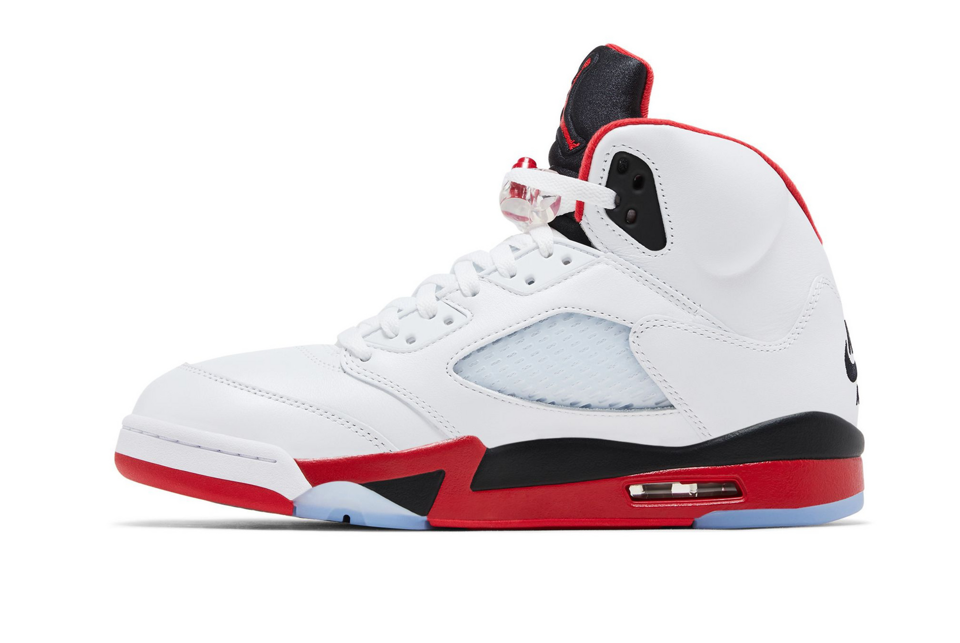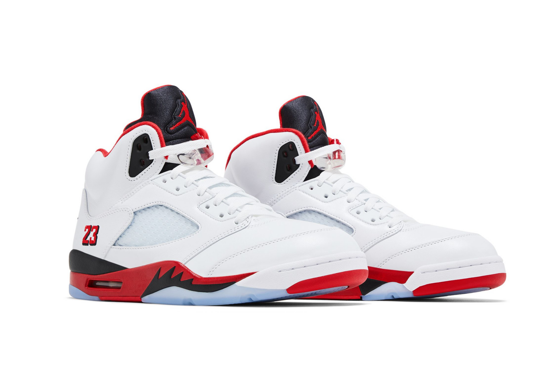 The 2025 edition of the Air Jordan 5 Retro 'Fire Red' brings back an OG colorway, designed by Tinker Hatfield and first released in 1990. The white leather upper is accented with quarter panel netting and contrasting black TPU eyelets. A red Jumpman icon stands out against the black tongue, while an embroidered '23' adorns the lateral heel. Classic Nike Air branding graces the back heel. A visible Air-sole unit enhances the red polyurethane midsole, accented with black shark tooth detailing and supported by a translucent rubber outsole.