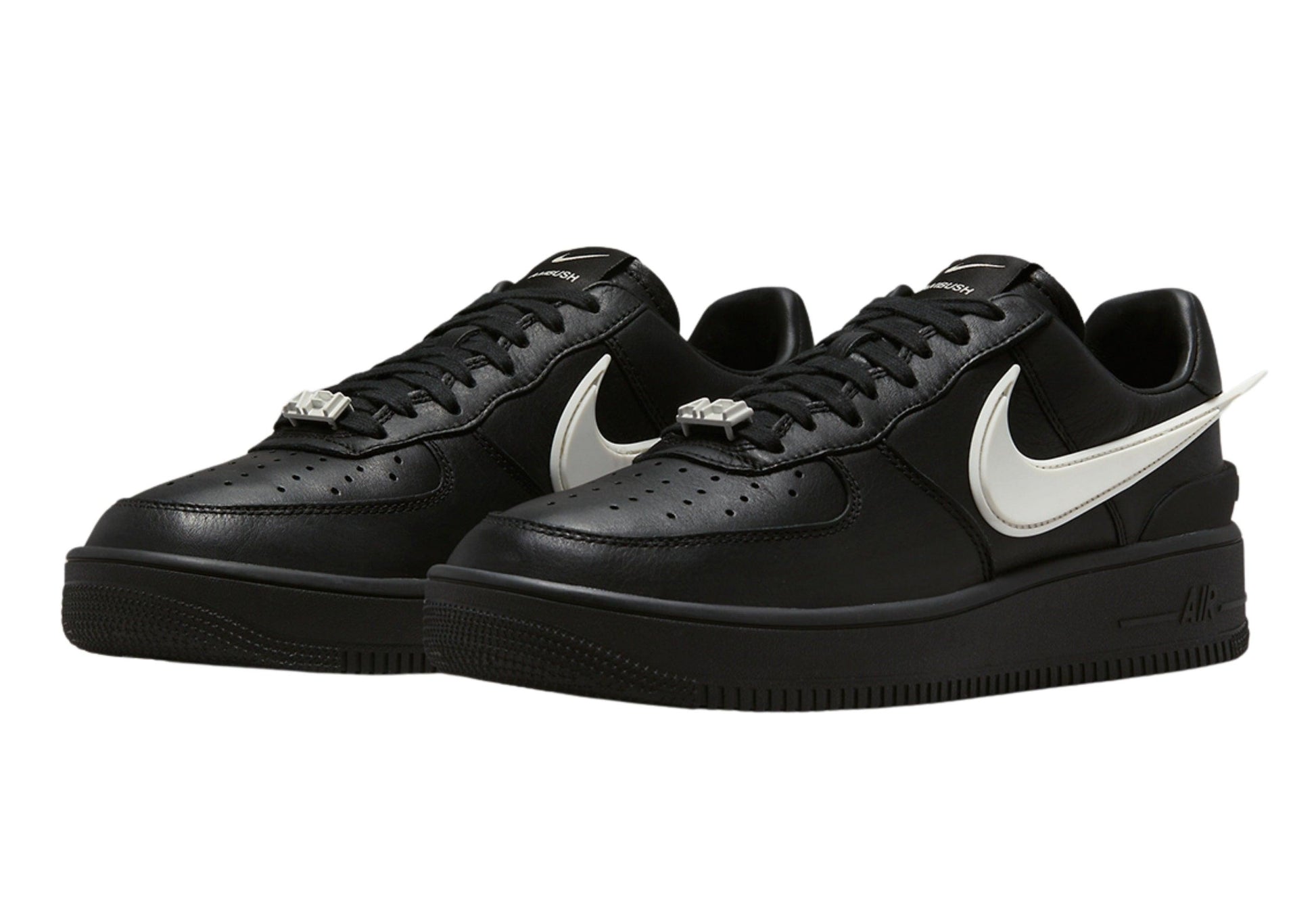Buy AMBUSH x Air Force 1 Low 'Black' in India from copyourdrip, The AMBUSH x Nike Air Force 1 Low ‘Black’ reunites the partner brands on a sleek interpretation of the vintage ‘80s hoops shoe. The upper is crafted from smooth black leather with an exaggerated TPU Swoosh in a contrasting white finish. In addition to a dual-branded tongue tag, ‘AMBUSH’ is spelled out in embossed lettering across the external heel counter. The low-top rests on a matching black rubber cupsole, featuring an Air-sole heel unit encapsulated in lightweight polyurethane.