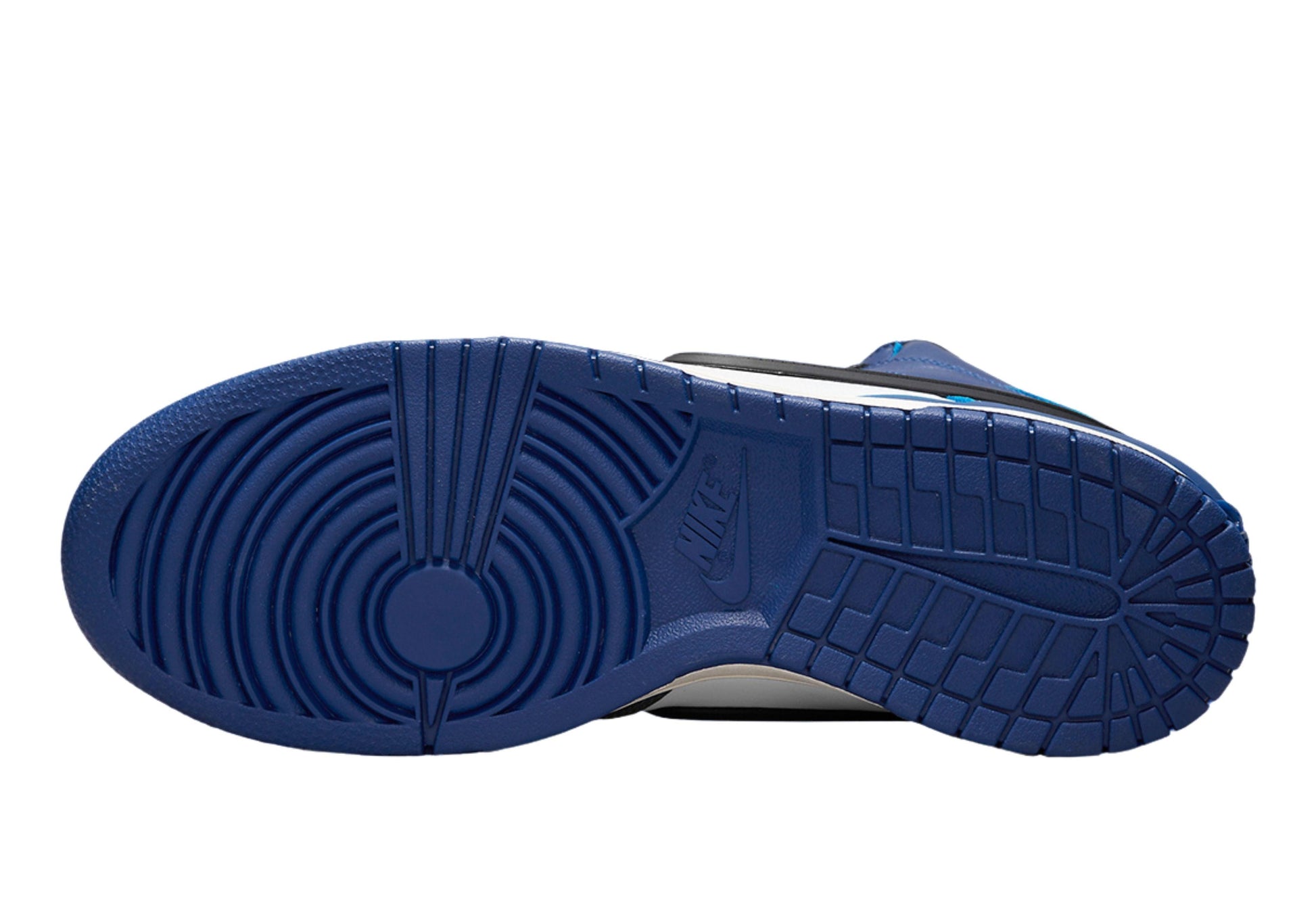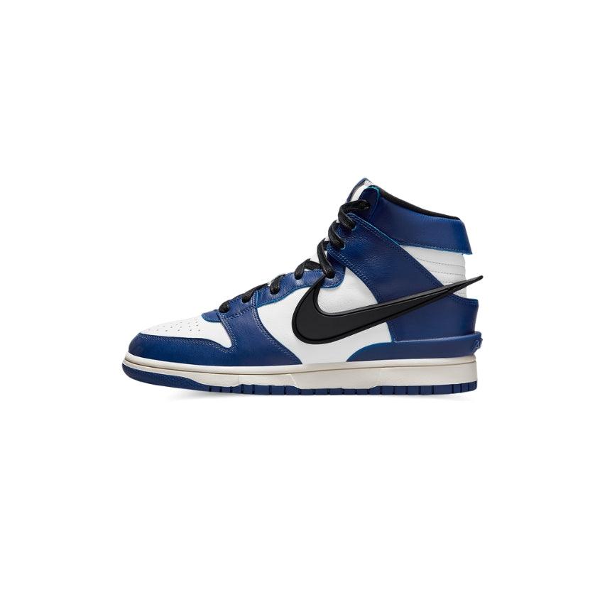 Buy AMBUSH x Dunk High 'Deep Royal' in India from copyourdrip.com, Designed in partnership with the Tokyo-based brand helmed by Yoon Ahn, the AMBUSH x Nike Dunk High ‘Deep Royal’ delivers a stylized take on the vintage silhouette. The all-leather upper combines a crisp white base with contrasting royal blue overlays and an oversized black Swoosh inspired by motorcycle tailpipes, featuring a tail that extends past the heel. AMBUSH branding lands on an external TPU heel counter and the woven tag that adorns an exposed foam tongue. The high-top rides on a standard rubber cupsole, highlighted by white sidewalls and a royal blue outsole.