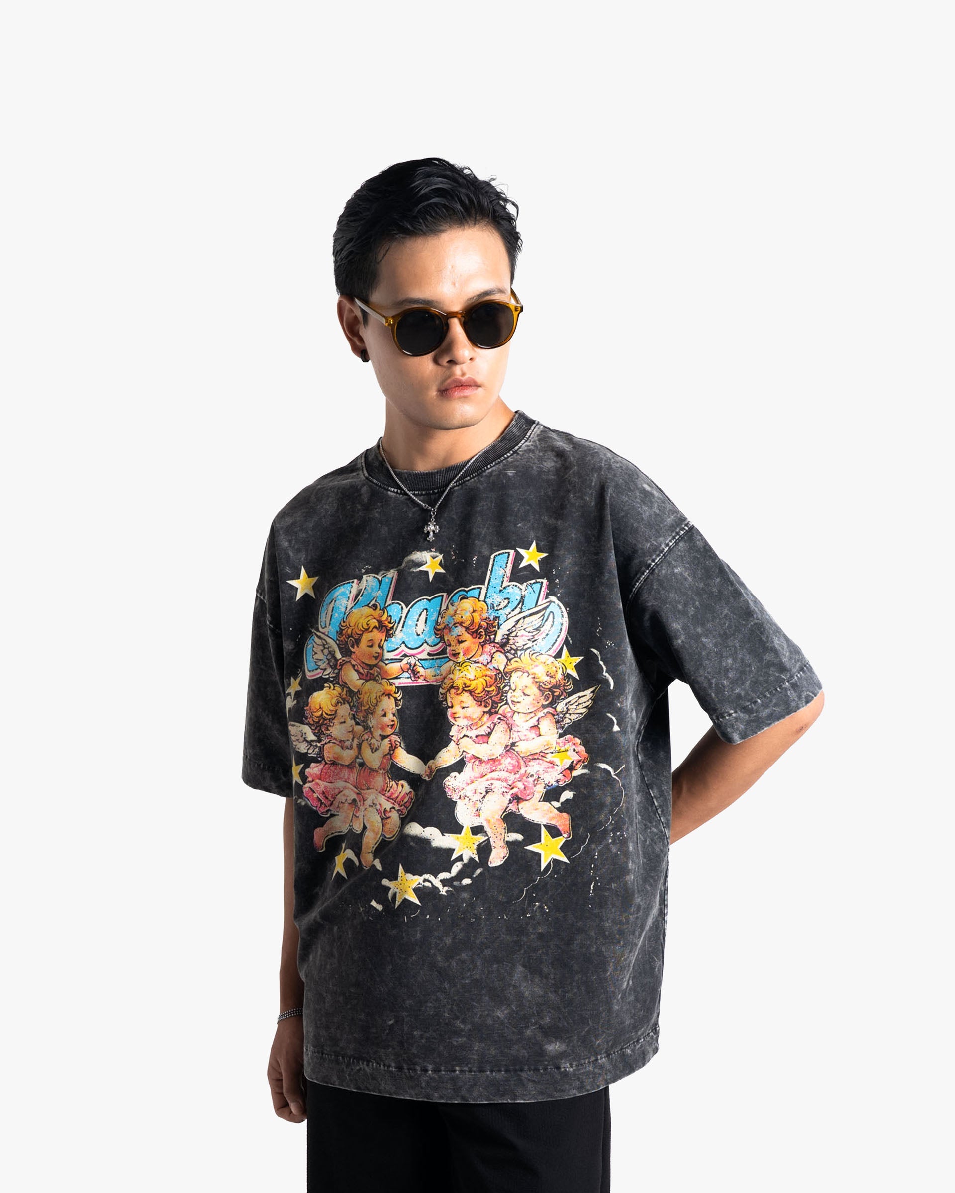 Crafted from 250 GSM Cotton Spandex Terry, the Angels oversized t-shirt delivers premium comfort with a relaxed streetwear fit. Featuring a stone washed effect for a naturally faded, vintage look, this piece showcases a dreamy retro cherub angel graphic that brings together old-school charm and modern streetwear aesthetics.