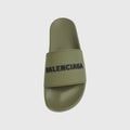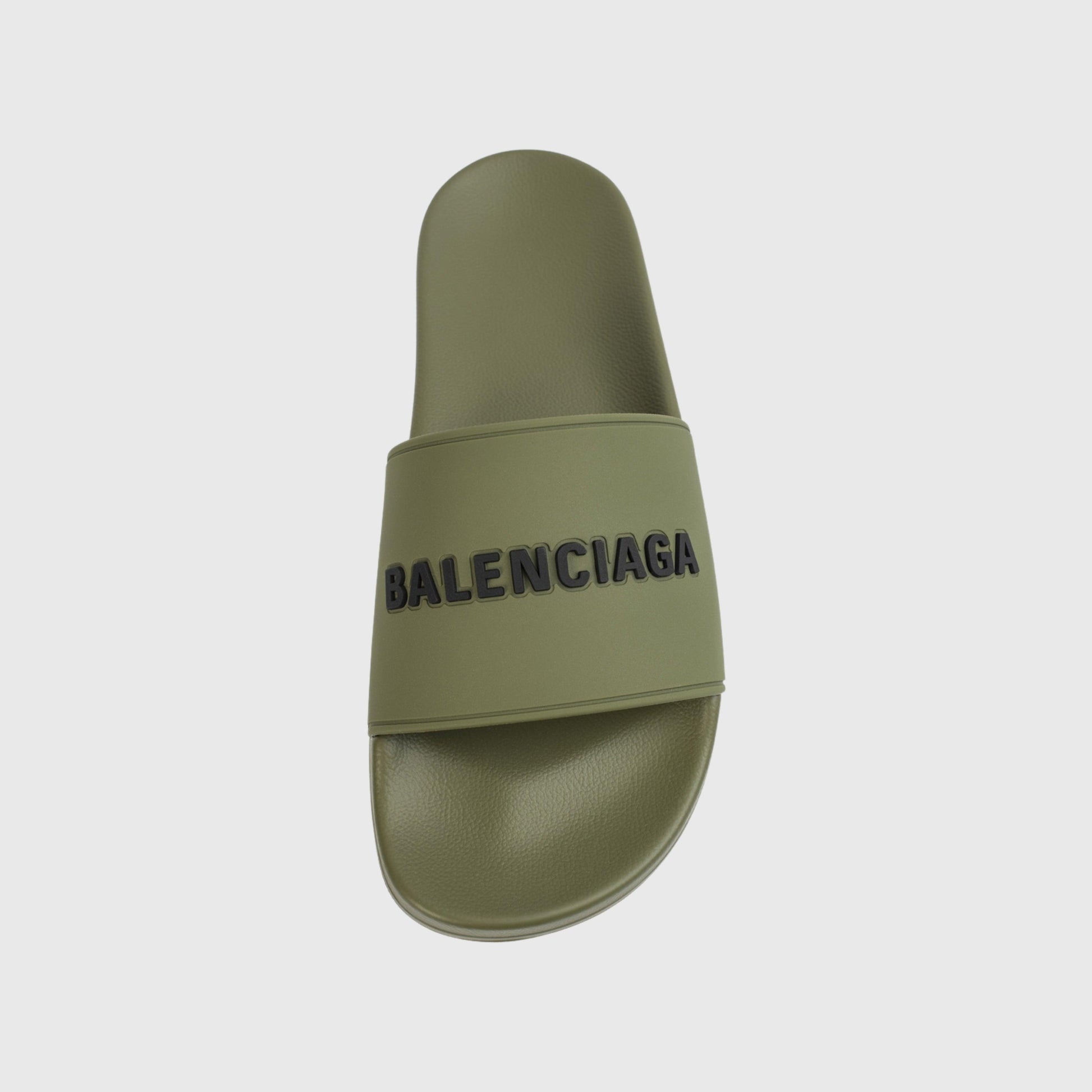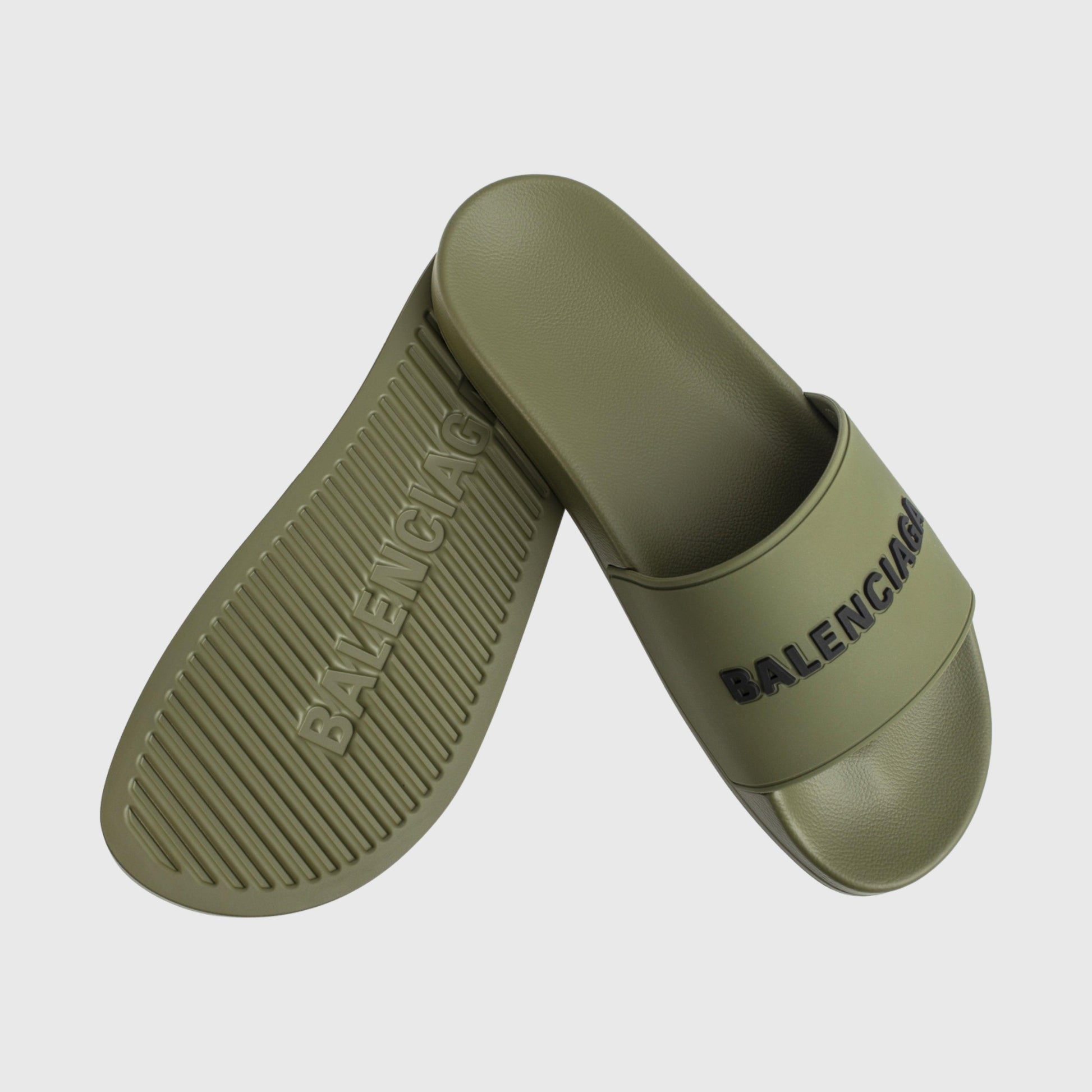 Buy Balenciaga Logo Print Pool Slides in India from copyourdrip.com, Balenciaga's pool slides offer comfort and style in equal measure. Designed with moulded footbeds, this khaki green pair is simply accented with a contrasting logo at the front.