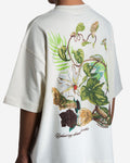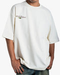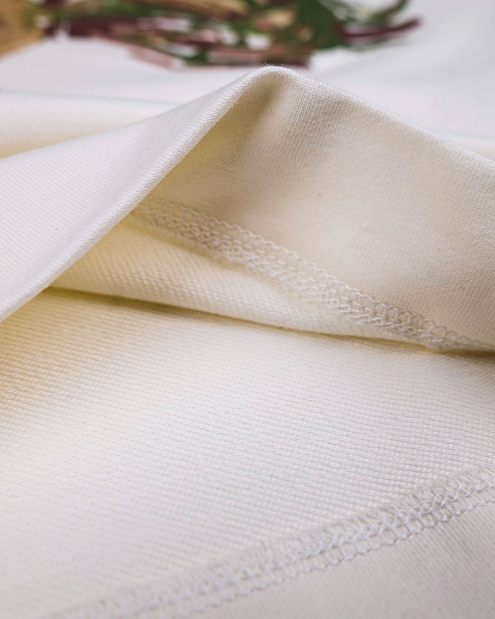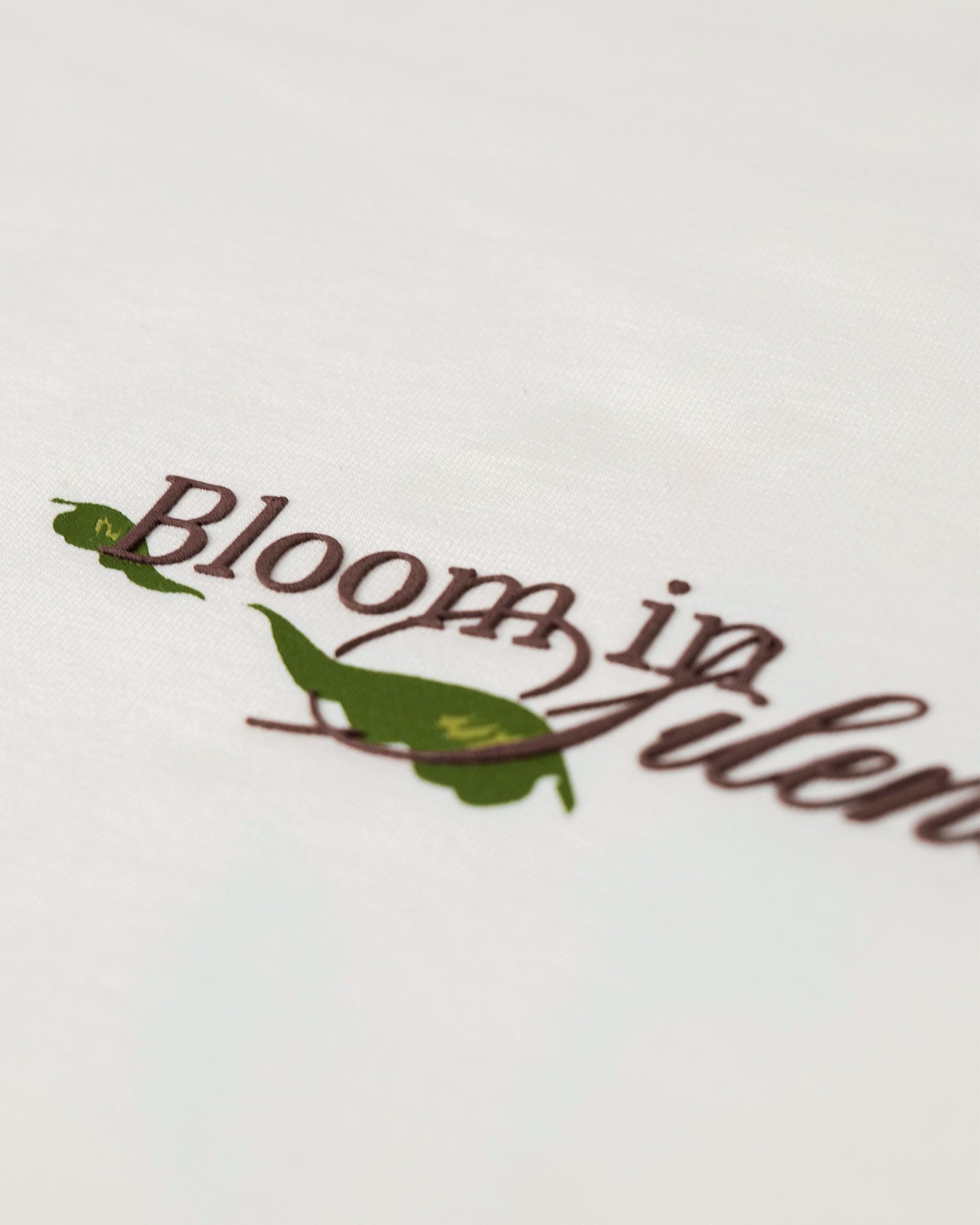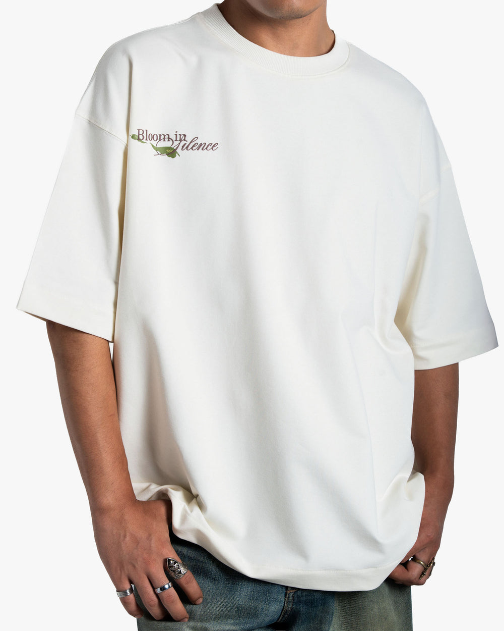 Crafted from 250 GSM Cotton Spandex Terry Looper with a double silicone finish, Bloom in Silence delivers an ultra-smooth, premium hand-feel designed for luxury streetwear enthusiasts. The pigment-free ivory canvas showcases a botanical back graphic with rich puff-print detailing, paired with subtle text on the front chest—making it a statement piece for modern minimalists and streetwear collectors alike.