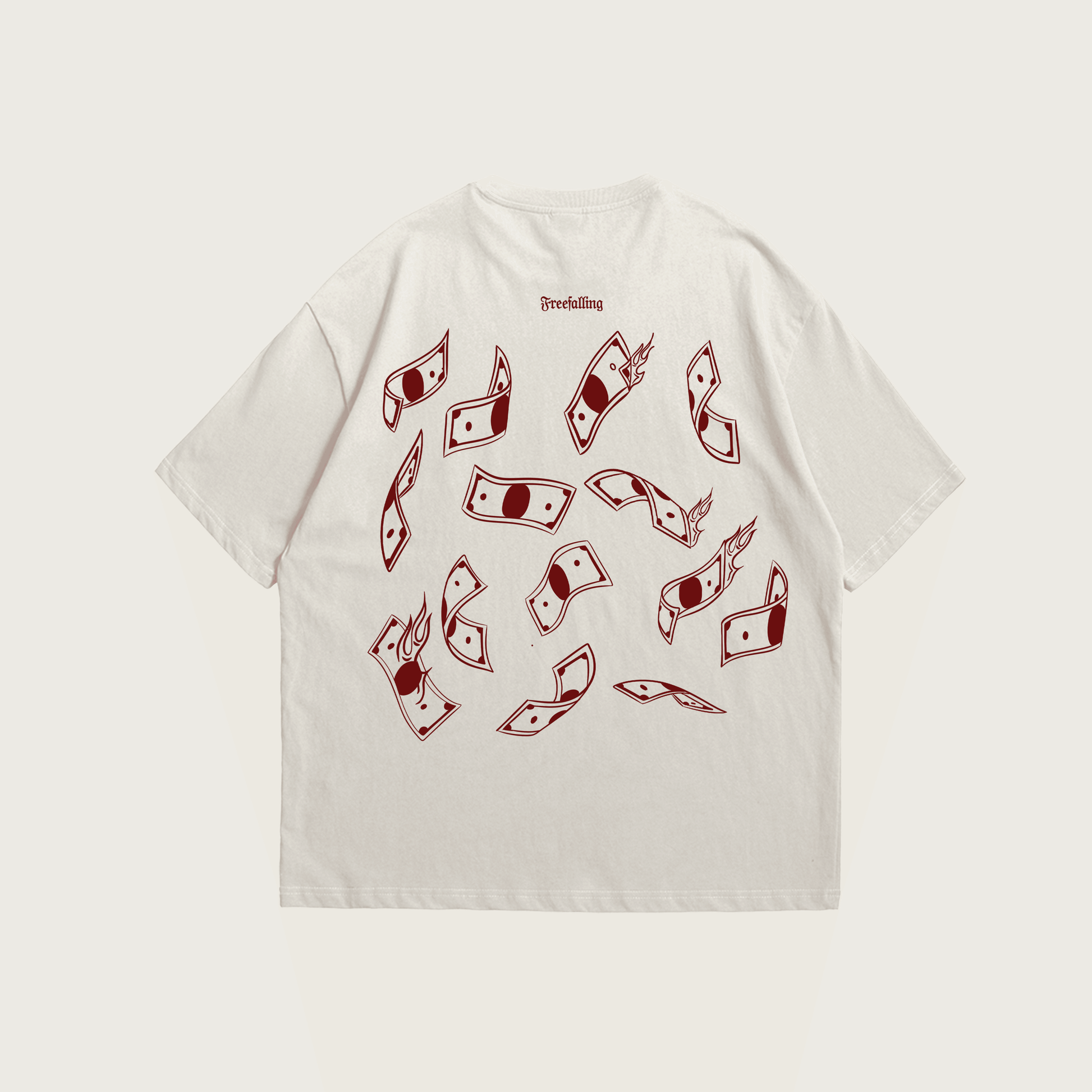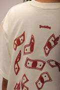Introducing the "Cash Cascade Tee". On the front, revel in a captivating scene of packed bills, while the back unveils a mesmerizing cascade of dollars in a scattered dance. Both prints are in puff, adding a tactile and stylish touch to this unique tee.