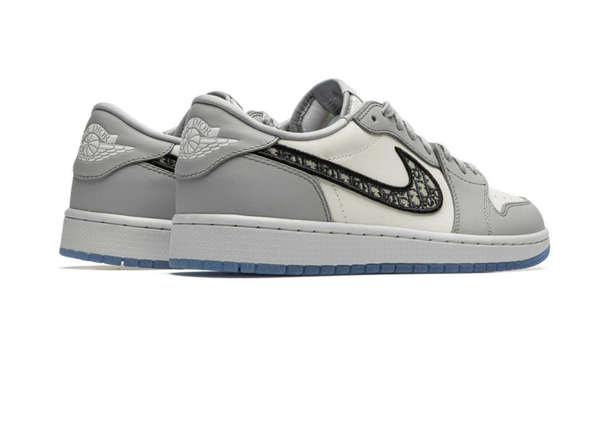 Buy Dior x Air Jordan 1 Low in India from copyourdrip.com , Launching as part of a larger collection with the esteemed Parisian fashion house, the Dior x Air Jordan 1 Low sports a simple two-tone color scheme on the upper, featuring a white Italian leather base with subtle grey leather overlays. Branding elements include a Dior Air woven tongue tag, Dior Oblique jacquard Swoosh and a Dior Wings logo on the heel tab. The made-in-Italy kicks are finished with translucent outsoles revealing additional branding hits underneath.