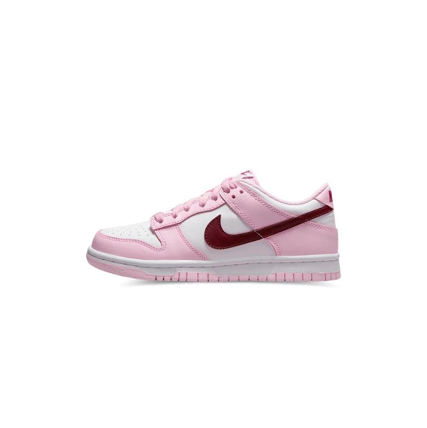 Buy Dunk Low GS 'Pink Foam' in India from copyourdrip.com , Offered in big kid sizing, the Nike Dunk Low GS ‘Pink Foam’ complements the shoe’s timeless lines with pastel accents. The all-leather upper features a white base with soft pink overlays and a signature Swoosh in burgundy. The latter hue is repeated on Nike branding hits at the tongue and heel tab. Reflecting the retro silhouette’s ‘80s roots, the low-top is mounted on a durable cupsole, highlighted by white sidewalls and a pink rubber outsole.