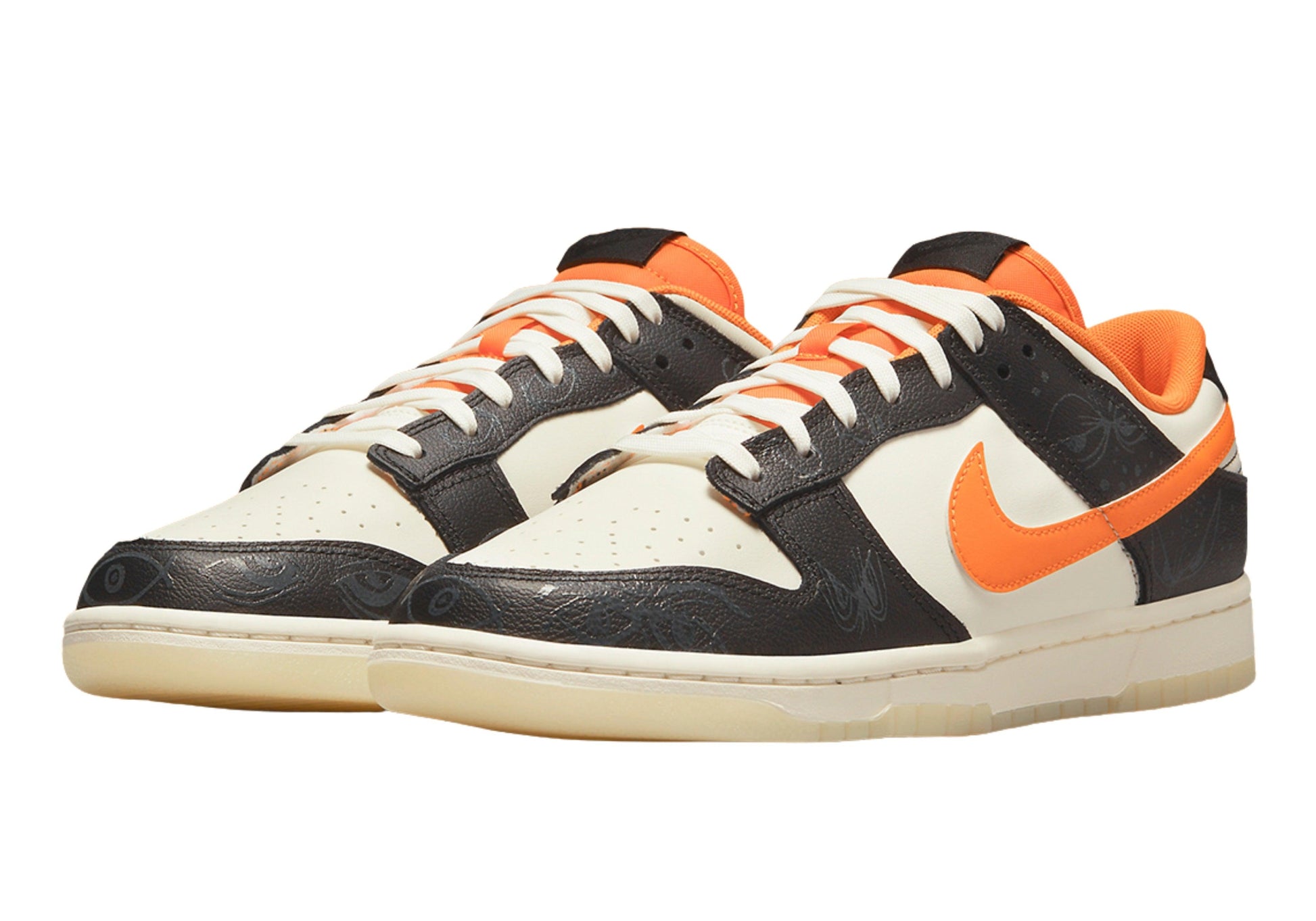 Buy Dunk Low Premium 'Halloween' 2021 in India from copyourdrip.com , The Nike Dunk Low Premium ‘Halloween’ rings in spooky season with a glow-in-the-dark translucent rubber outsole. Up top, black leather overlays are covered in tonal graphics that similarly light up when the lights go down. The rest of the upper is constructed from off-white leather with a synthetic leather Swoosh in Starfish orange. The same hue is repeated on the tongue, collar lining and insole, featuring a creepy-crawly spider graphic alongside traditional Nike branding.