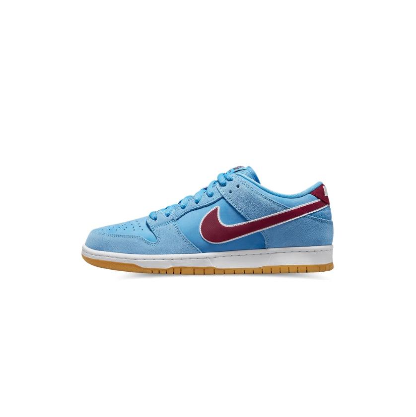 Buy Dunk Low Premium SB 'Philadelphia Phillies' in India from copyourdrip.com , While the retro silhouette is rooted in basketball, the Nike Dunk Low Premium SB ‘Philadelphia Phillies’ shifts the focus to the baseball diamond, featuring a distinctive color palette that pays homage to the historic MLB franchise. The suede upper is finished in Valor Blue, contrasted by a Team Maroon Swoosh outlined in white trim. A Nike SB tag decorates the stuffed tongue, while mismatched interior tags display a cheesesteak graphic on the left shoe and a Liberty Bell graphic on the right. Underfoot, a gum rubber outsole provides grippy traction.
