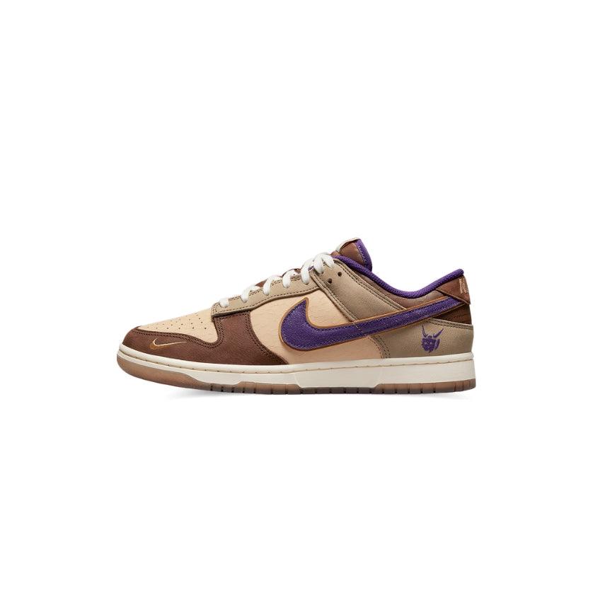 Buy Dunk Low Premium 'Setsubun' in India from copyourdrip.com , The Nike Dunk Low Premium ‘Setsubun’ takes its name from a Japanese springtime festival, in which celebrants toss roasted soybeans around the house as a means of warding off evil spirits. A subtle cracked texture is applied to the beige leather upper, fortified with suede overlays in brown and tan. Contrasting purple accents settle on the collar lining and Swoosh, as well as an embroidered demon graphic on the lateral heel. Inside the shoe, custom sockliners feature Edo-period artwork that depicts a legendary demon-slaying warrior.