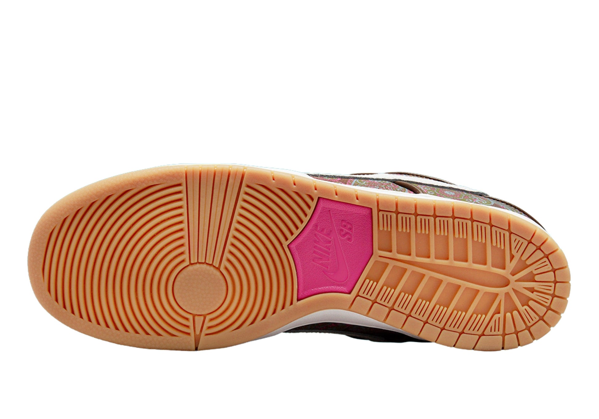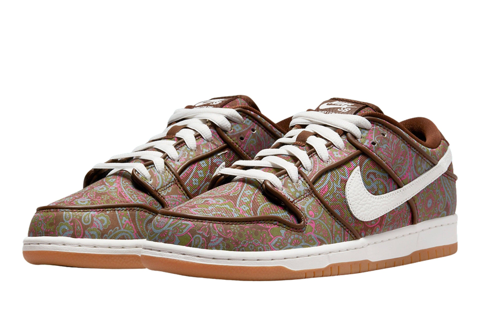 Buy Dunk Low Pro Premium SB 'Paisley' in India from copyourdrip.com , The Nike Dunk Low Pro Premium SB ‘Paisley’ treats the retro sneaker to a vintage-fashion makeover. Rendered in a blend of green, pink, blue, and brown hues, an allover paisley print permeates the textile upper, trimmed in brown leather piping and designed to tear away over time, revealing an off-white suede underlay. Branding elements include a white leather Swoosh and an embroidered Nike wordmark on the brown leather heel tab. Underfoot, a gum rubber outsole provides grippy traction.