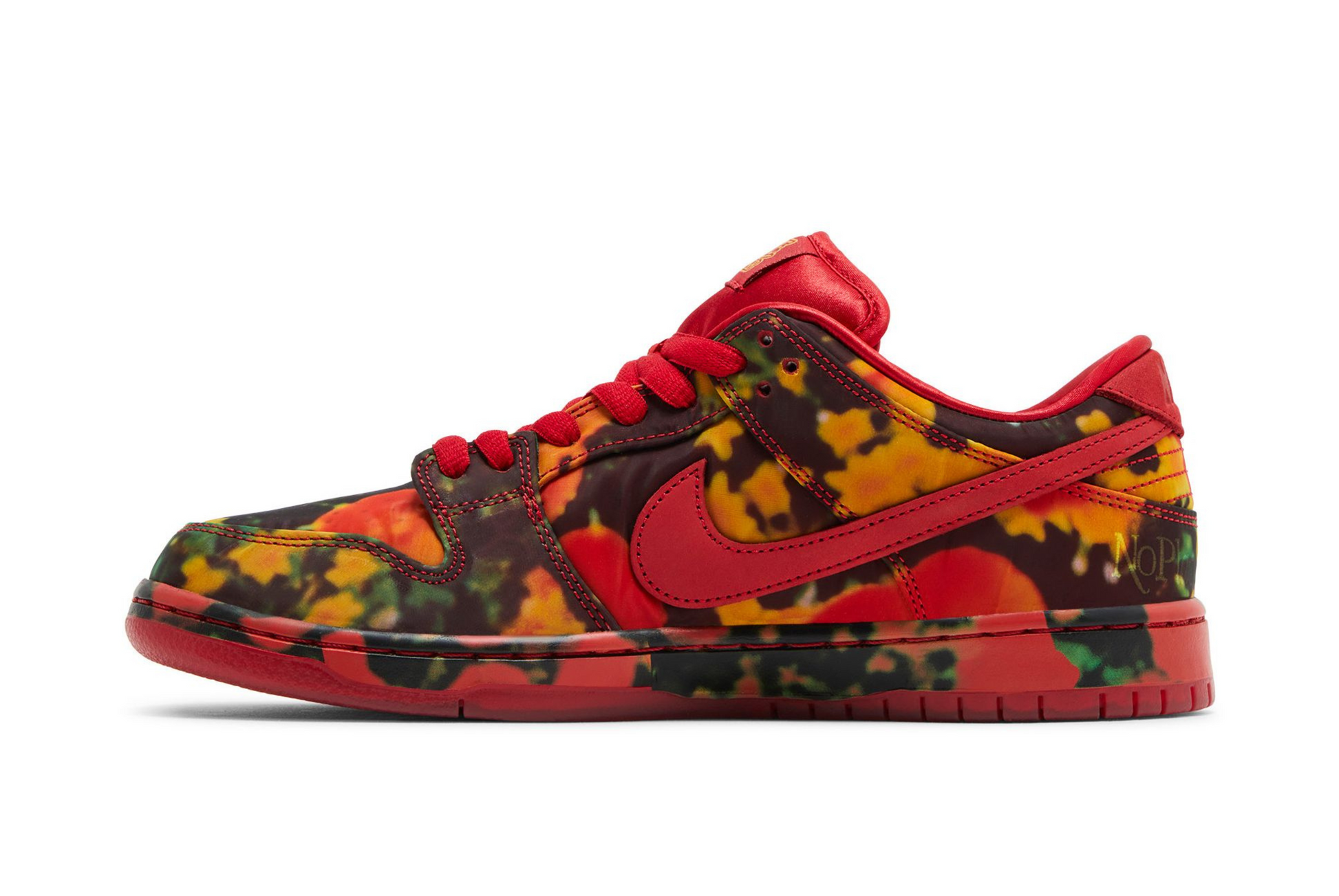 The Wizard of Oz x Nike Dunk Low SB 'Poppy Field' pays tribute to the classic 1939 film. Red satin lines the upper, covered in an all-over print featuring the poppy fields of Oz. The silky top layer is designed to tear away, revealing a suede base in a deep scarlet hue — a nod to Dorothy's ruby slippers. Woven tongue tags display mismatched Nike SB and 'The Wizard of Oz' branding, while 'No place like home' is stitched across the back heel. Inside the shoe, a Nike SB-branded insole depicts the Wicked Witch of the West with one of her flying monkeys. The colorful poppy print continues on the midsole, supported underfoot by a crimson translucent rubber outsole.