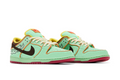 The Dunk Low SB 'Rodeo', also known as 'Tourmaline', showcases a bright green suede upper secured with braided rope laces. A black suede Swoosh graces the side panel, while unique Sonora-style embroidery decorates the heel overlay. Contrasting pops of color arrive via orange piping, a yellow textile lining, and an orange leather back tab marked with crimson Nike branding. Inside the shoe, the sockliner features custom artwork that depicts a cowboy herding cattle.