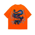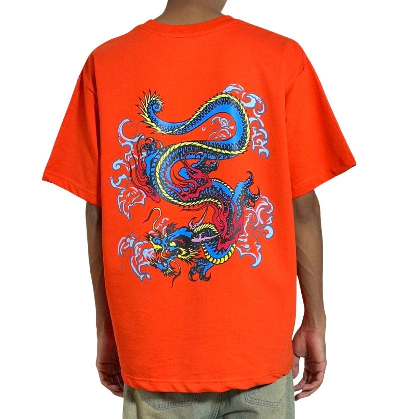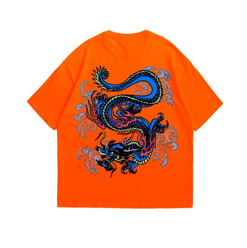 The back of the tee features a powerful screen-printed dragon, a symbol of strength, wisdom, and resilience. This intricately detailed image captures the mythical essence of the dragon, making a bold statement about the wearer's fearless spirit and unyielding determination.