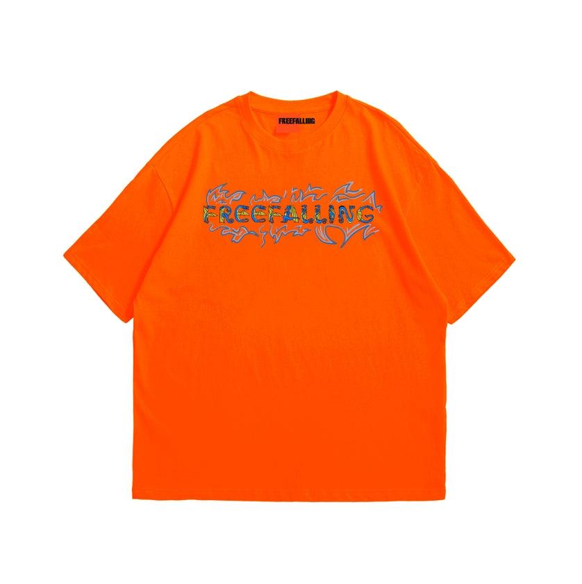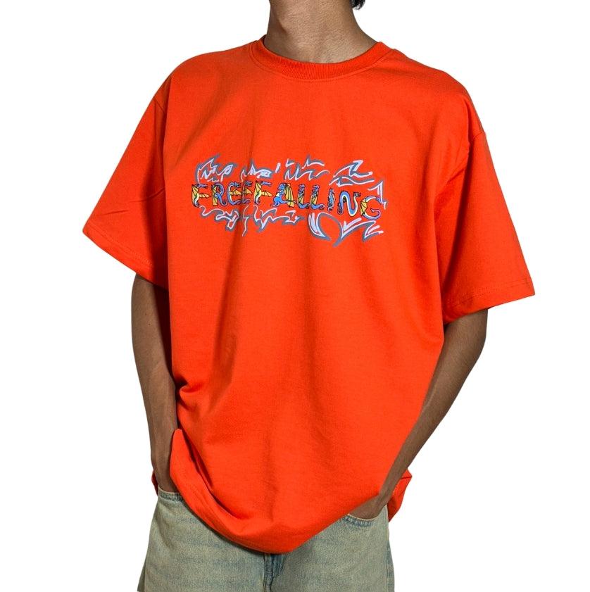 On the front, the Freefalling logo is showcased in a bold dragon font, brought to life with the textured elegance of puff print. This unique design element adds depth and a tactile dimension to the tee, making a striking first impression.