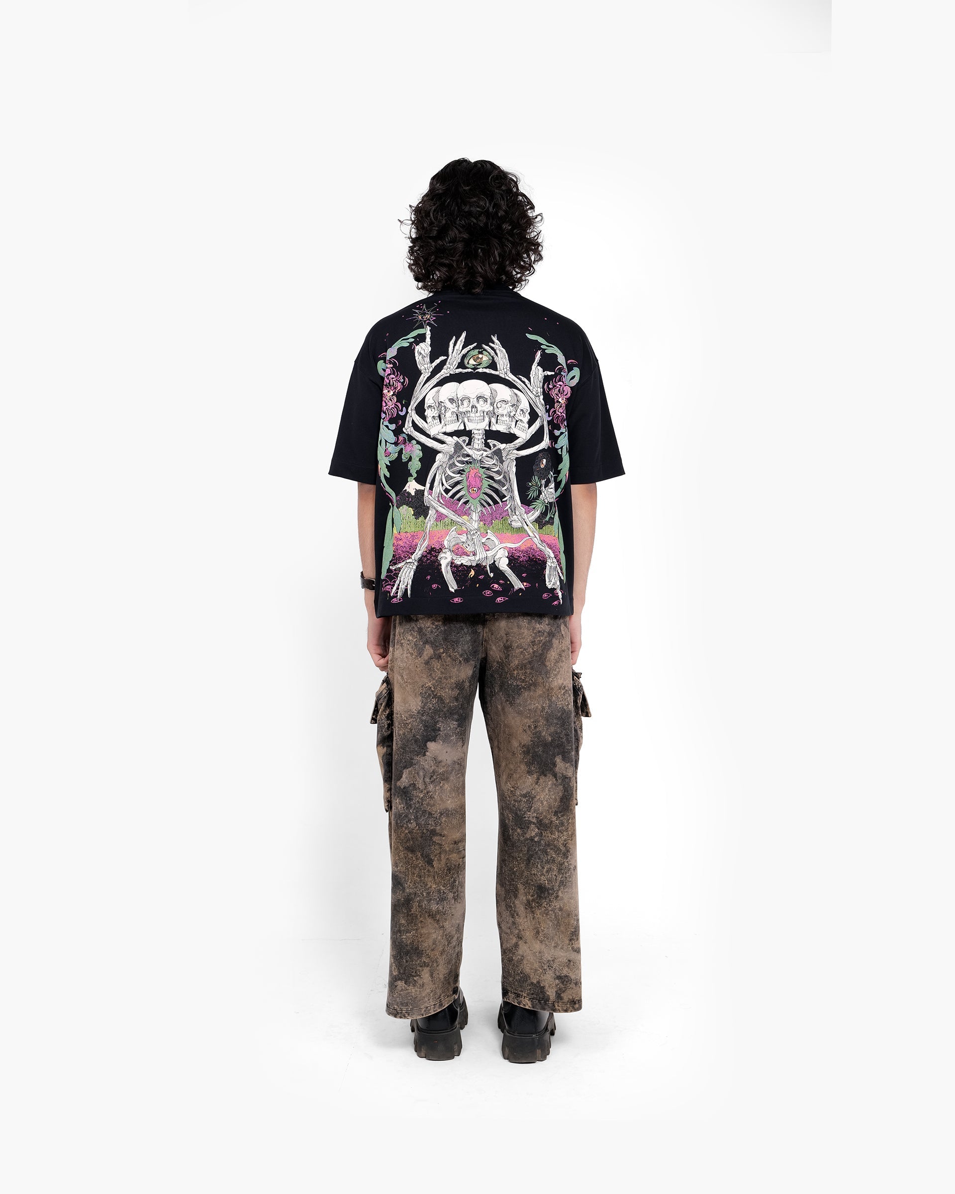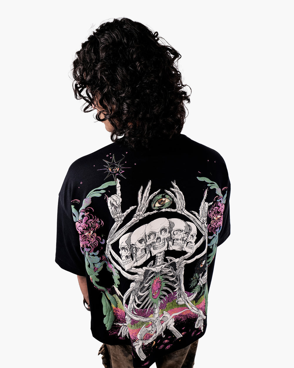 The back features a hypnotic puff print illustration of a skeletal figure crowned by multiple skulls, framed by blooming vines, piercing eyes, and cosmic symbols. This surreal design evokes themes of rebirth, consciousness, and psychedelic elegance. Finished in deep blacks with vivid pink, violet, and green tones, this tee commands attention while staying rooted in elevated streetwear style.