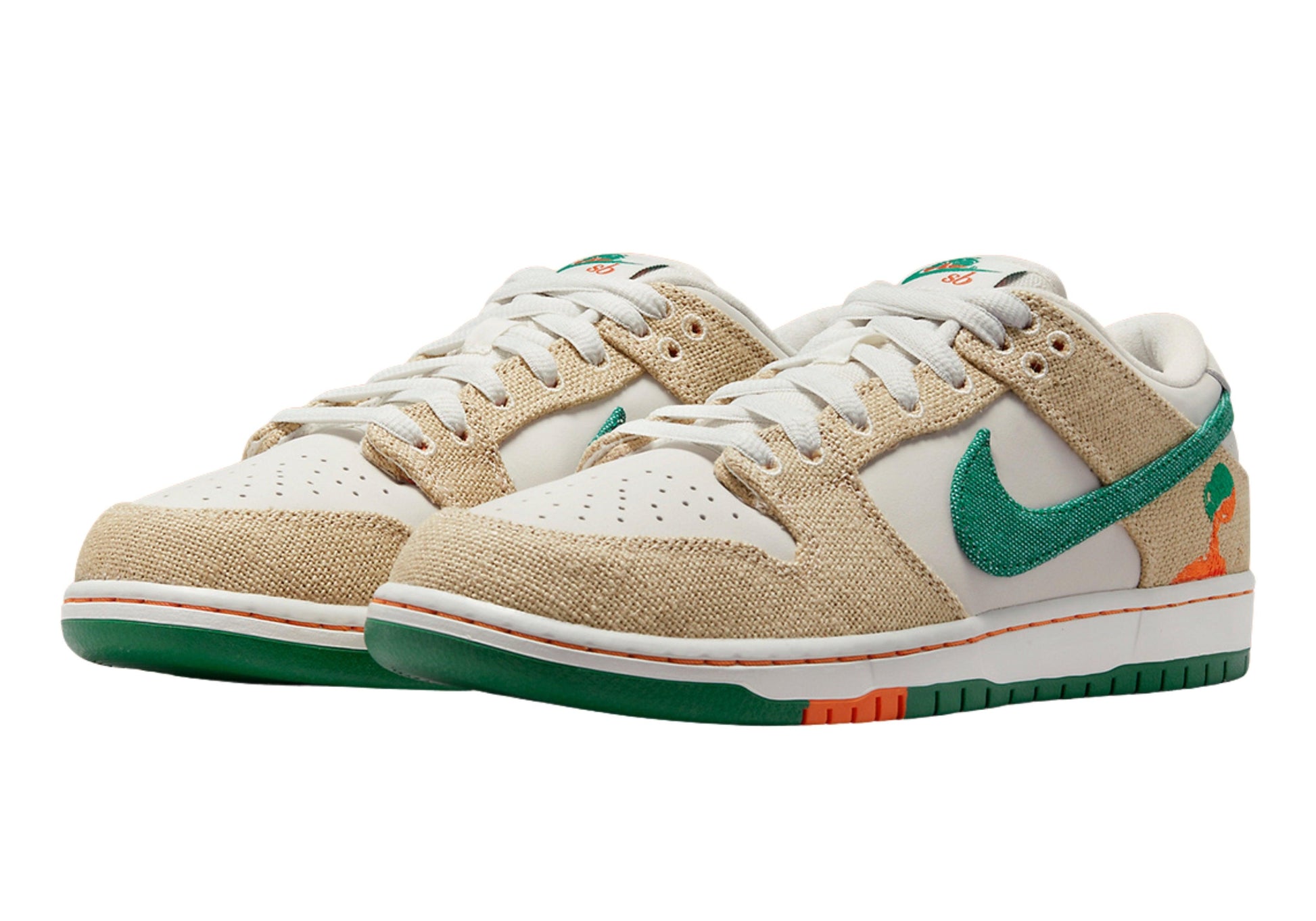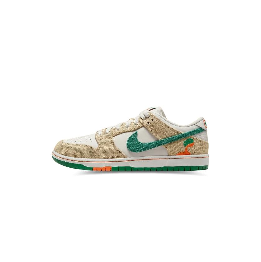 Buy Jarritos x Dunk Low SB in India from copyourdrip.com , The Jarritos x Nike Dunk Low SB showcases a collaborative design inspired by the popular Mexican soda brand. The upper combines a Phantom white leather base with hemp canvas overlays and a Malachite green textile Swoosh. The Jarritos logo is embroidered in green and orange on the lateral heel, while dual branding embellishes the woven tongue tag. Mismatched heel tabs are emblazoned with 'Nike' and 'Jarritos' across the left and right shoe. Anchoring the sneaker is a durable rubber cupsole that pairs white sidewalls with a two-tone green and orange outsole.