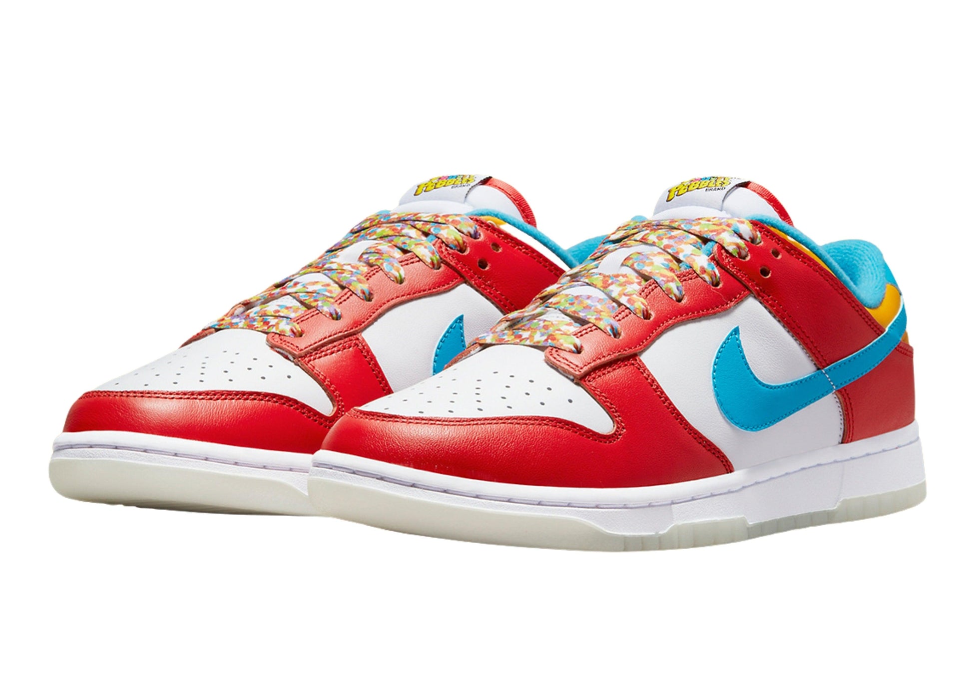 Buy LeBron James x Fruity Pebbles x Dunk Low in India from copyourdrip.com , The LeBron James x Fruity Pebbles x Nike Dunk Low pays tribute to the sugary cereal favored by the generational NBA star. Multicolor laces secure the smooth leather upper, featuring a white base with scarlet overlays and a powder blue Swoosh. A woven Fruity Pebbles tag decorates the tongue, while LeBron’s LJ logo is embroidered on the heel tab. Inside the shoe, a Nike-branded sockliner reveals a Fruity Pebble graphic print. A milky translucent rubber outsole provides grippy traction underfoot.