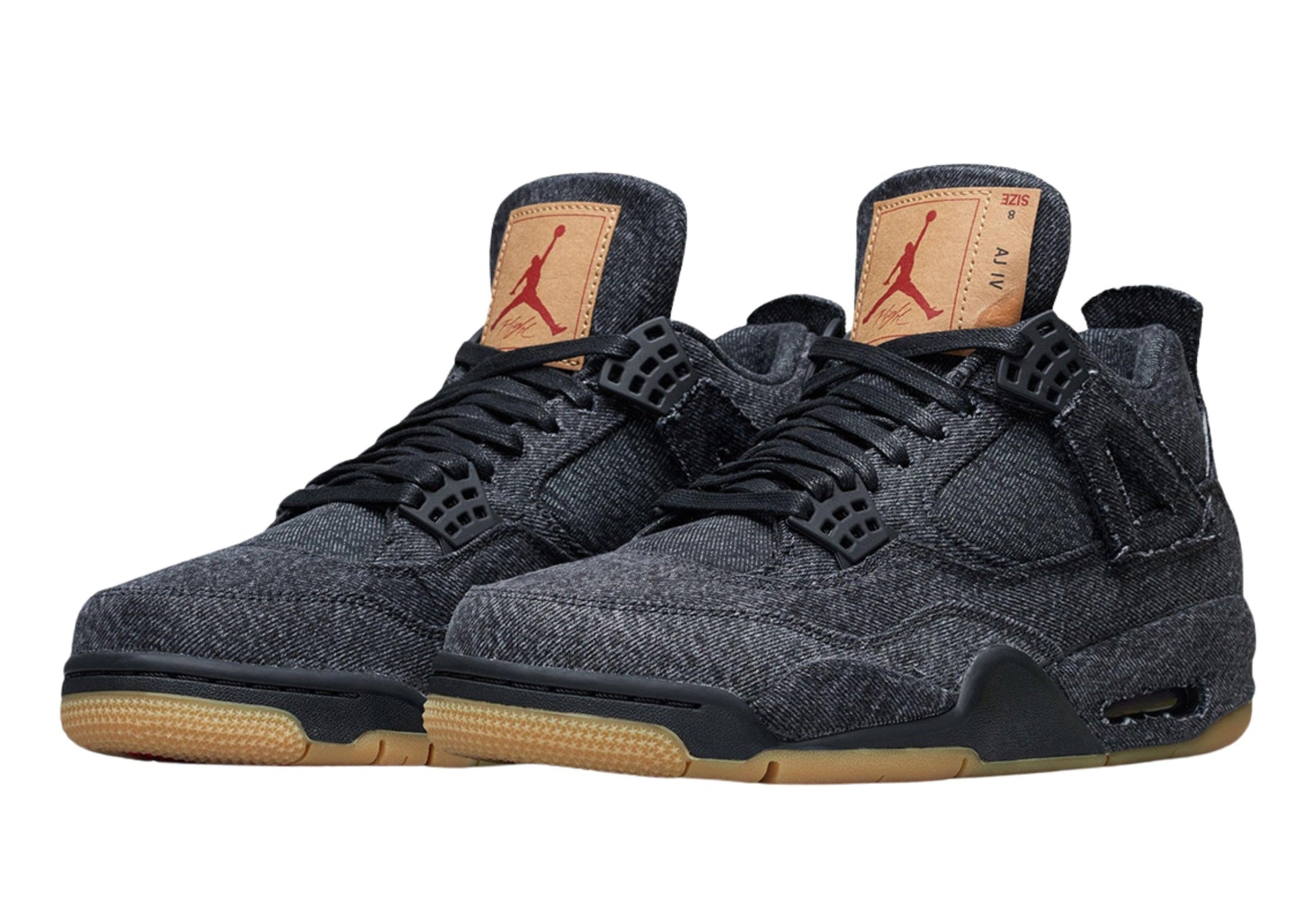 Buy Levi's x Air Jordan 4 Retro GS 'Black Denim' in India from copyourdrip.com, Nike looked to the denim experts at Levi’s for help in giving the Air Jordan 4 an all-new look in 2018. In both men’s and grade school sizes, the design is dressed almost entirely in black denim. Signature details include Levi’s iconic ‘Two Horses’ paper patch rebranded with a red Jumpan logo on the tongue, a trademark red Levi’s tab, and gum rubber outsole.
