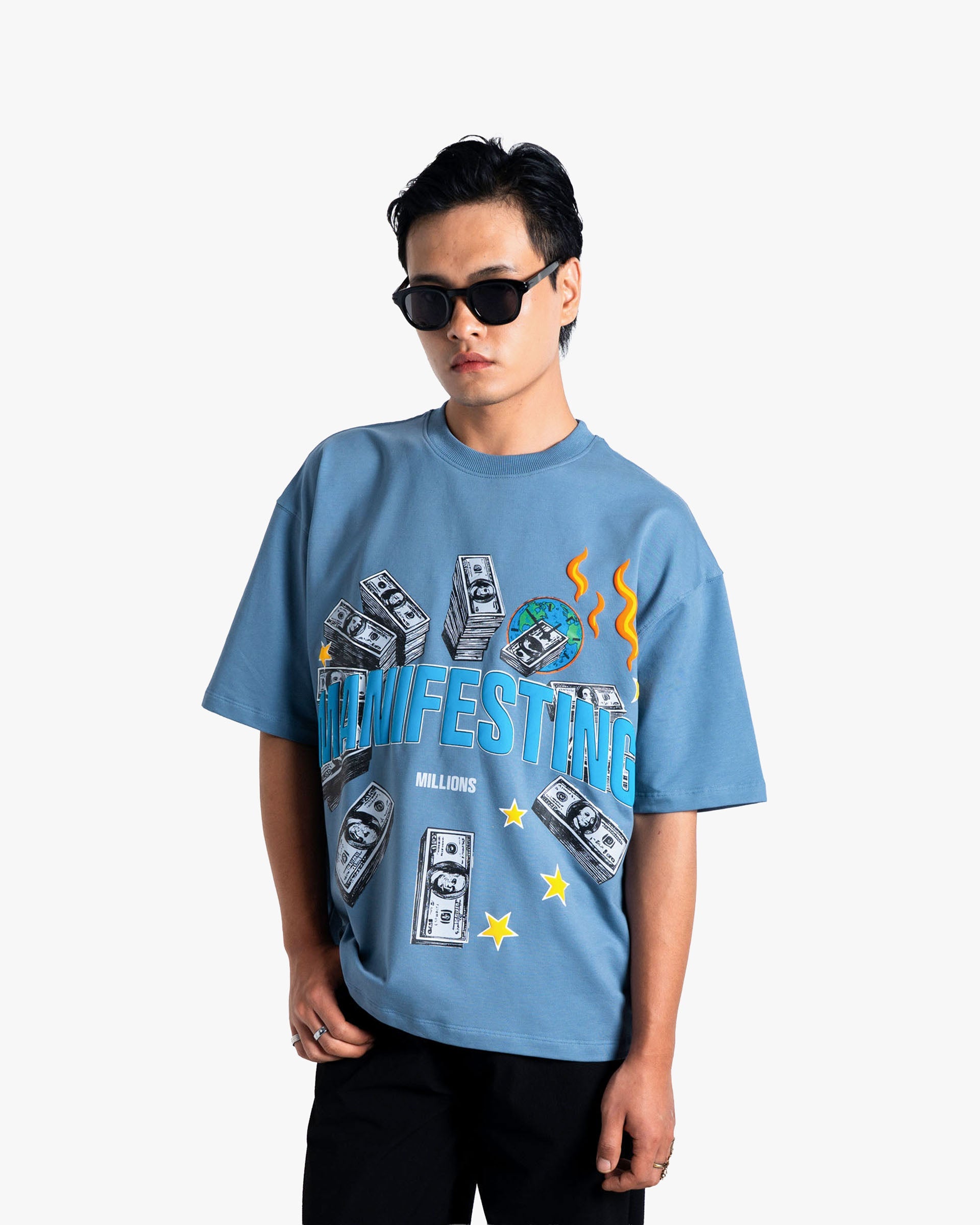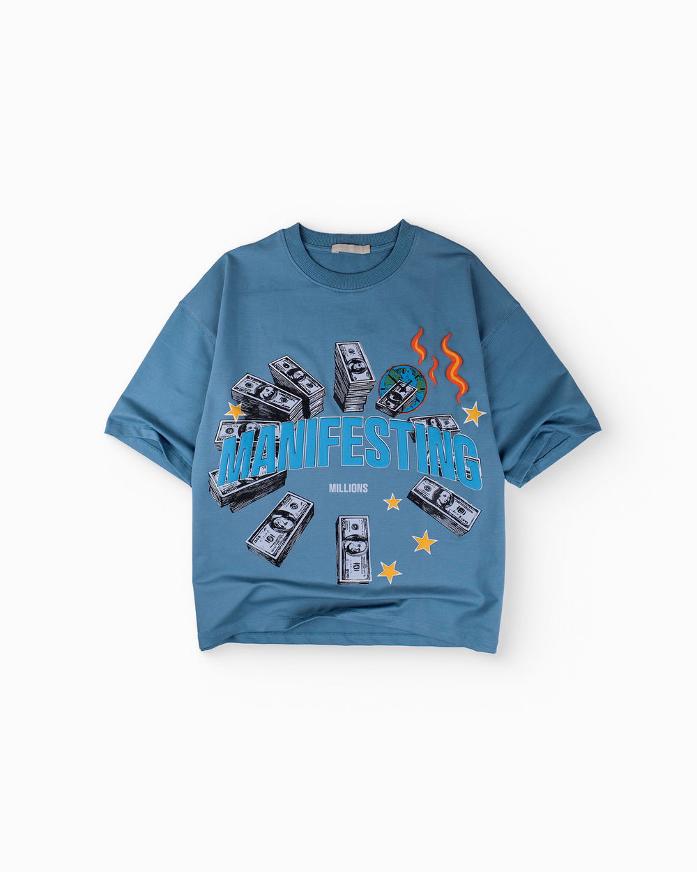 With a drop-shoulder fit, relaxed oversized silhouette, and unisex design, the Manifesting Millions t-shirt pairs effortlessly with baggy cargos, baggy jeans, or joggers—making it a versatile urban fashion essential.