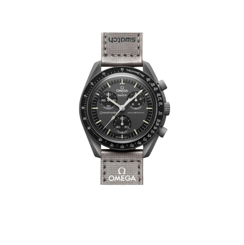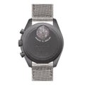 With its intense deep grey color and metallic grey VELCRO© strap, this watch means business. The chronograph's seconds hand, subdial hands and tachymeter scale are in white. The subdials and bezel background are black. All dials carry the OMEGA X Swatch branding, as well as the iconic Speedmaster logo and the new MoonSwatch logo. The biosourced glass construction, the “hidden” S integrated in the center of the crystal, the fine and sophisticated circular pattern on the dial outer ring and the recessed subdials, the sharp and smooth lugs construction, the iconic “dot over 90” detail on the tachymeter scaled bezel, and of course the unique Bioceramic touch are common to all models. All hours, minutes, chronograph seconds hands and hour markers sport Super-LumiNova® for a perfect glow in the dark.