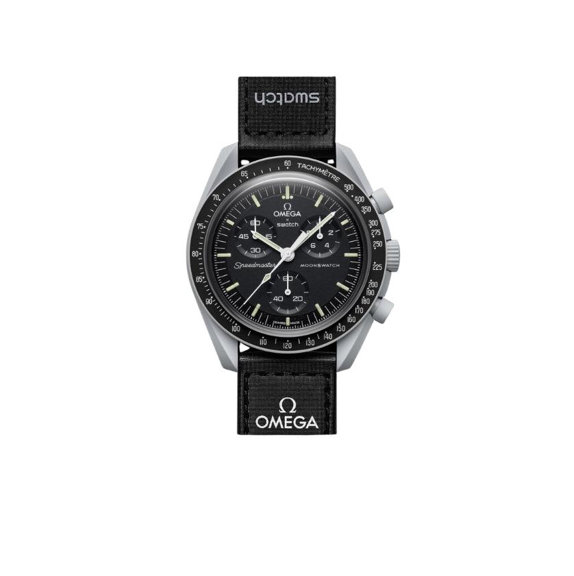 This steel gray watch is complete with a black VELCRO© strap. All hands and the tachymeter scale are in white, just like in the original Moonwatch. All dials carry the OMEGA X Swatch branding, as well as the iconic Speedmaster logo and the new MoonSwatch logo. The biosourced glass construction, the “hidden” S integrated in the center of the crystal, the fine and sophisticated circular pattern on the dial outer ring and the recessed subdials, the sharp and smooth lugs construction, the iconic “dot over 90” detail on the tachymeter scaled bezel, and of course the unique Bioceramic touch are common to all models. All hours, minutes, chronograph seconds hands and hour markers sport Super-LumiNova® for a perfect glow in the dark.