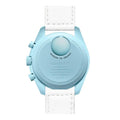 Pastel blue meets a bright white VELCRO© strap on this model. The chronograph's seconds hand, counter hands and tachymeter scale background are in white. All dials carry the OMEGA X Swatch branding, as well as the iconic Speedmaster logo and the new MoonSwatch logo. The biosourced glass construction, the “hidden” S integrated in the center of the crystal, the fine and sophisticated circular pattern on the dial outer ring and the recessed subdials, the sharp and smooth lugs construction, the iconic “dot over 90” detail on the tachymeter scaled bezel, and of course the unique Bioceramic touch are common to all models. All hours, minutes, chronograph seconds hands and hour markers sport Super-LumiNova® for a perfect glow in the dark.