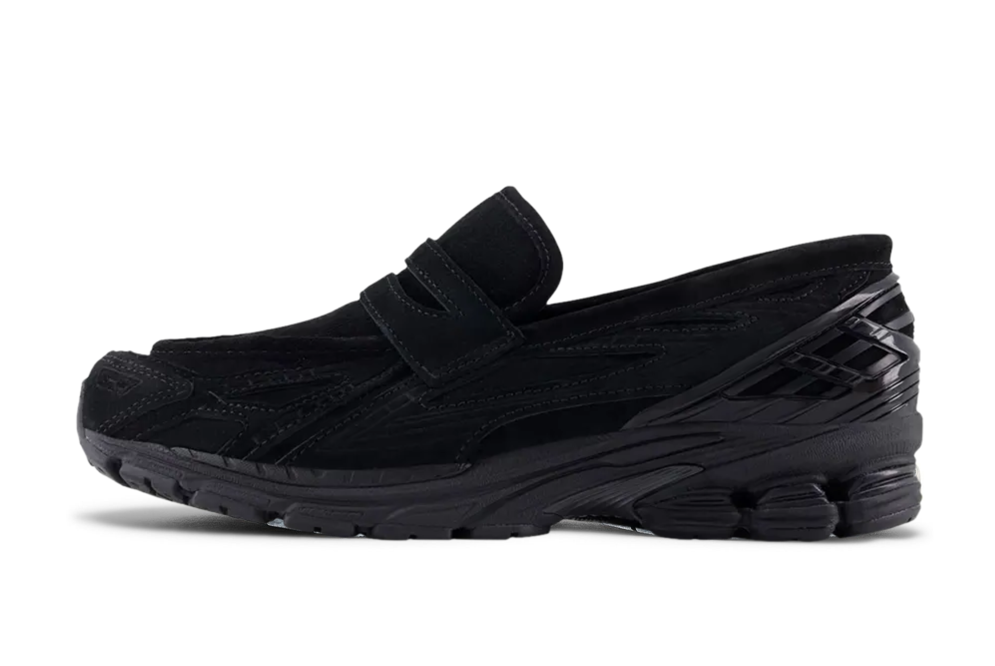 The New Balance 1906L 'Black Suede' reimagines the 1906R running shoe as a classic penny loafer. Rendered in a tonal black finish, the mesh upper features suede overlays and a glossy TPU heel cage. The slip-on is equipped with a low-cut collar and a traditional penny loafer saddle atop the vamp. The hybrid silhouette is mounted on an 860v2 sole unit in matching black, complete with ACTEVA LITE cushioning, shock absorbing N-ergy, and segmented ABZORB SBS pods at the heel.