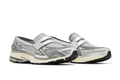 The New Balance 1906L 'Silver Shadow Grey' presents a hybrid silhouette that's half-running shoe and half-penny loafer. Ventilated grey mesh is utilized on the upper, fortified with synthetic leather overlays in matching grey and metallic silver. A molded TPU heel cage offers rearfoot stability. The slip-on is mounted on tooling borrowed from the New Balance 860v2, featuring a pre-yellowed ACTEVA LITE midsole with ABZORB SBS cushioning in the heel.