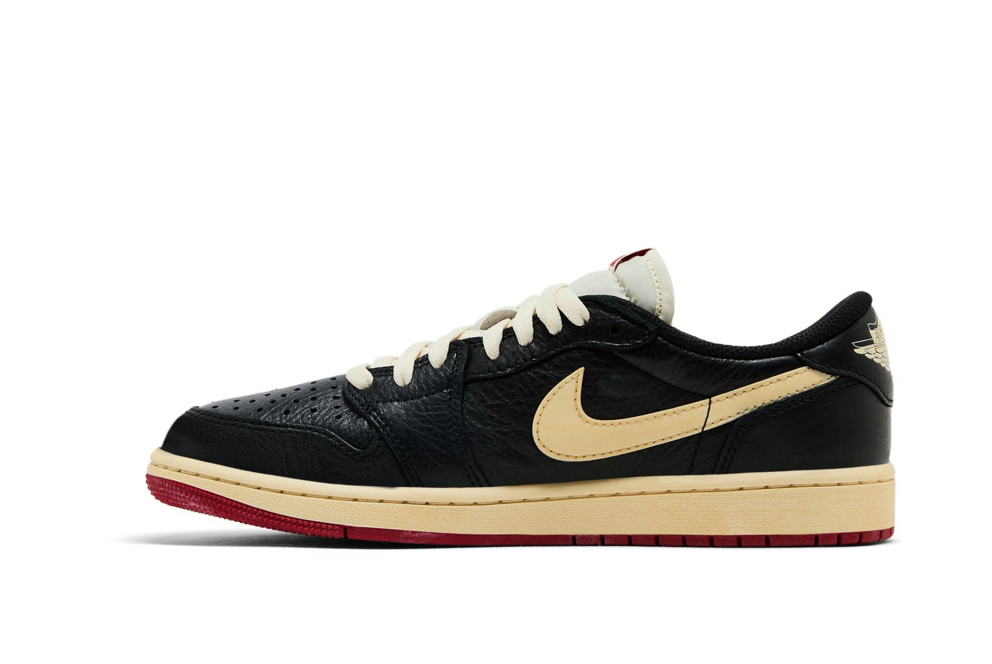 The Nigel Sylvester x Air Jordan 1 Low OG 'Better With Time' takes inspiration from an unreleased AJ1 High that was gifted to the BMX star in 2022. The low-top sports a black tumbled leather upper, featuring abrasions and scuff marks throughout. A woven 'Bike Air' tag graces the Muslin-colored nylon tongue, matching the signature Swoosh and the Wings logo stamped on the back tab. An embroidered mini-Swoosh adorns the lateral forefoot. The sneaker rests on a durable cupsole, highlighted by aged off-white sidewalls and a pre-distressed rubber outsole in Varsity Red.