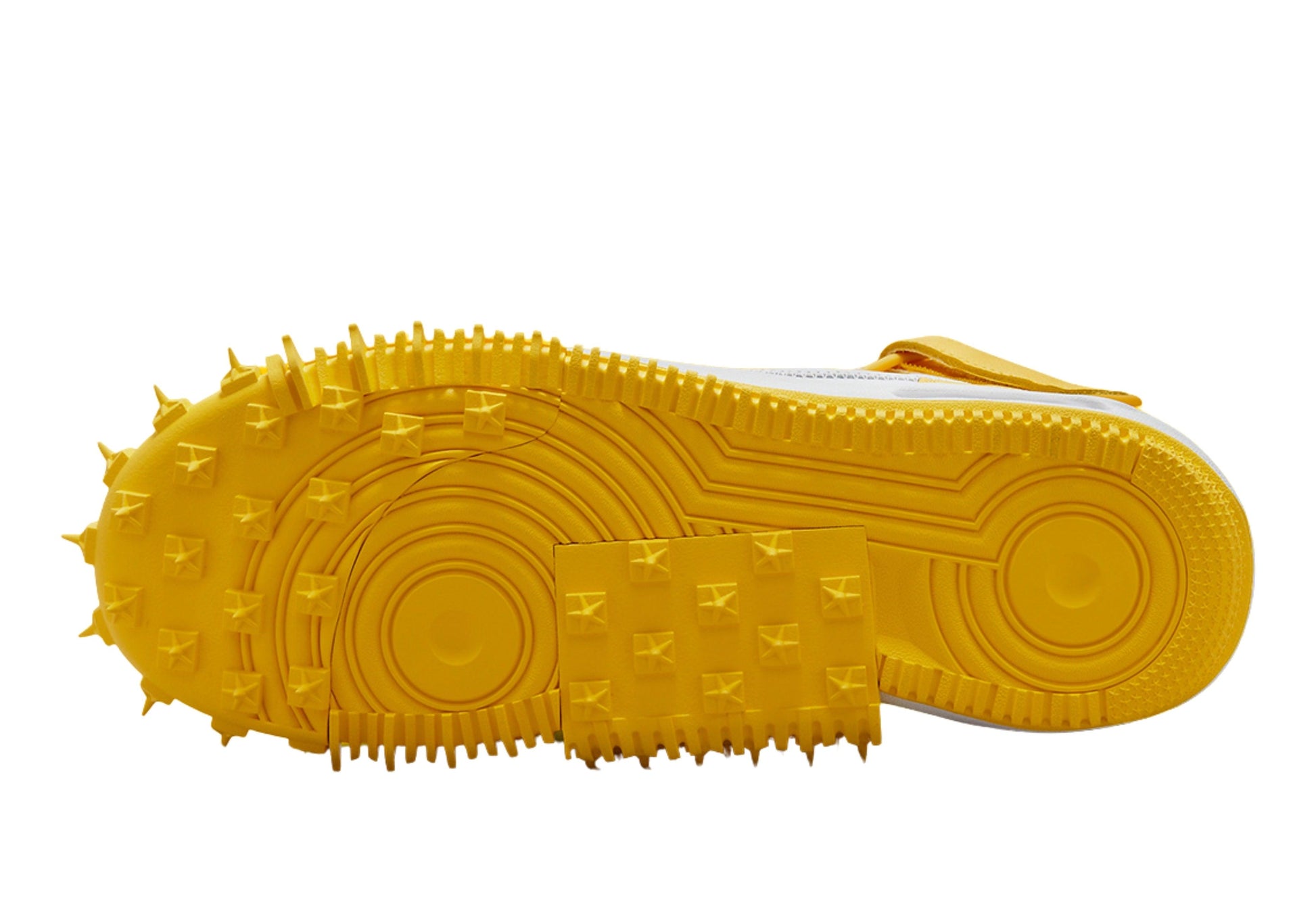 Buy Off-White x Air Force 1 Mid SP Leather 'Varsity Maize' in India from copyourdrip.com , The Off-White x Nike Air Force 1 Mid SP Leather ‘Varsity Maize’ updates the classic silhouette with a retooled build, highlighted by a wavy midsole with visible Air-sole cushioning and a rubber spiked outsole. A two-tone leather upper in white and yellow is secured with traditional lace closure, along with a supplemental lacing system that loops through exposed Flywire cables. In addition to a white leather Swoosh outlined in tonal zigzag stitching, branding elements include Off-White text on the medial side panel and a grim reaper graphic embroidered on the lateral heel.