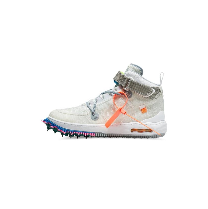 Buy Off-White x Air Force 1 Mid 'White' in India from copyourdrip.com , The Off-White x Nike Air Force 1 Mid ‘White’ gives the vintage hoops shoe a fashionable makeover that carries on the visionary legacy of Virgil Abloh. The mid-top carries a white mesh upper, enlivened with a subtle woodgrain print and accented with a translucent Swoosh. In addition to an adjustable ankle strap, the sneaker is secured with traditional laces and a secondary set that feeds through Flywire cables. Signature Off-White flourishes include a coral plastic zip tie and lines of Helvetica text printed on the medial side. The updated midsole features a wavy topline with visible Air-sole cushioning in the heel. Underfoot, the pivot point rubber outsole is studded with track spikes for an edgy aesthetic.
