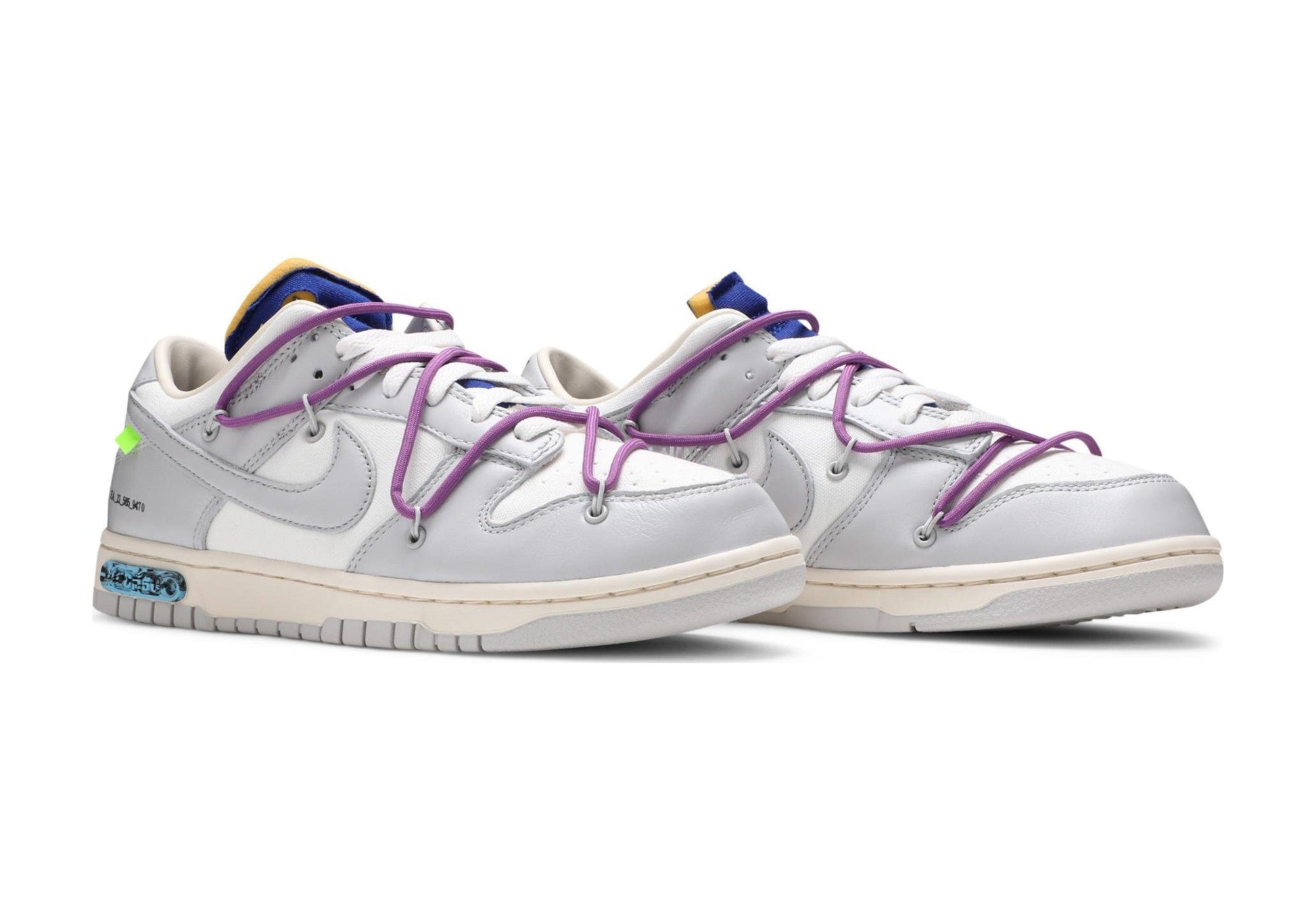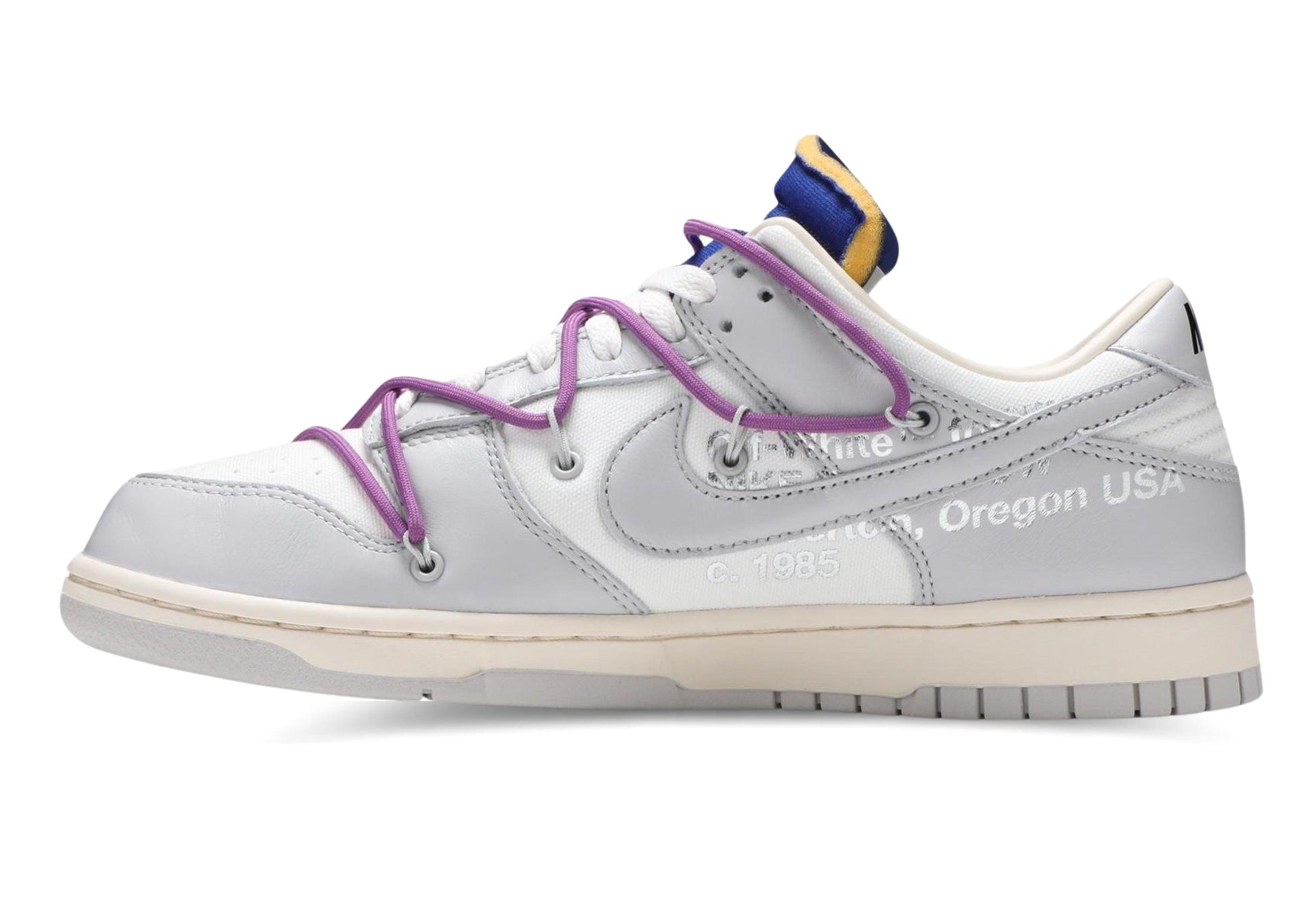 Buy Off-White x Dunk Low 'Lot 48 of 50' in India from copyourdrip.com, This Off-White x Nike Dunk Low is taken from the ‘Dear Summer’ collection, a sprawling follow-up to Virgil Abloh’s first Nike Dunk collaboration from 2019. The low-top makes use of a white leather upper with soft grey canvas overlays, along with Virgil Abloh’s calling-card flourishes, which include a plastic zip tie and printed Helvetica text.