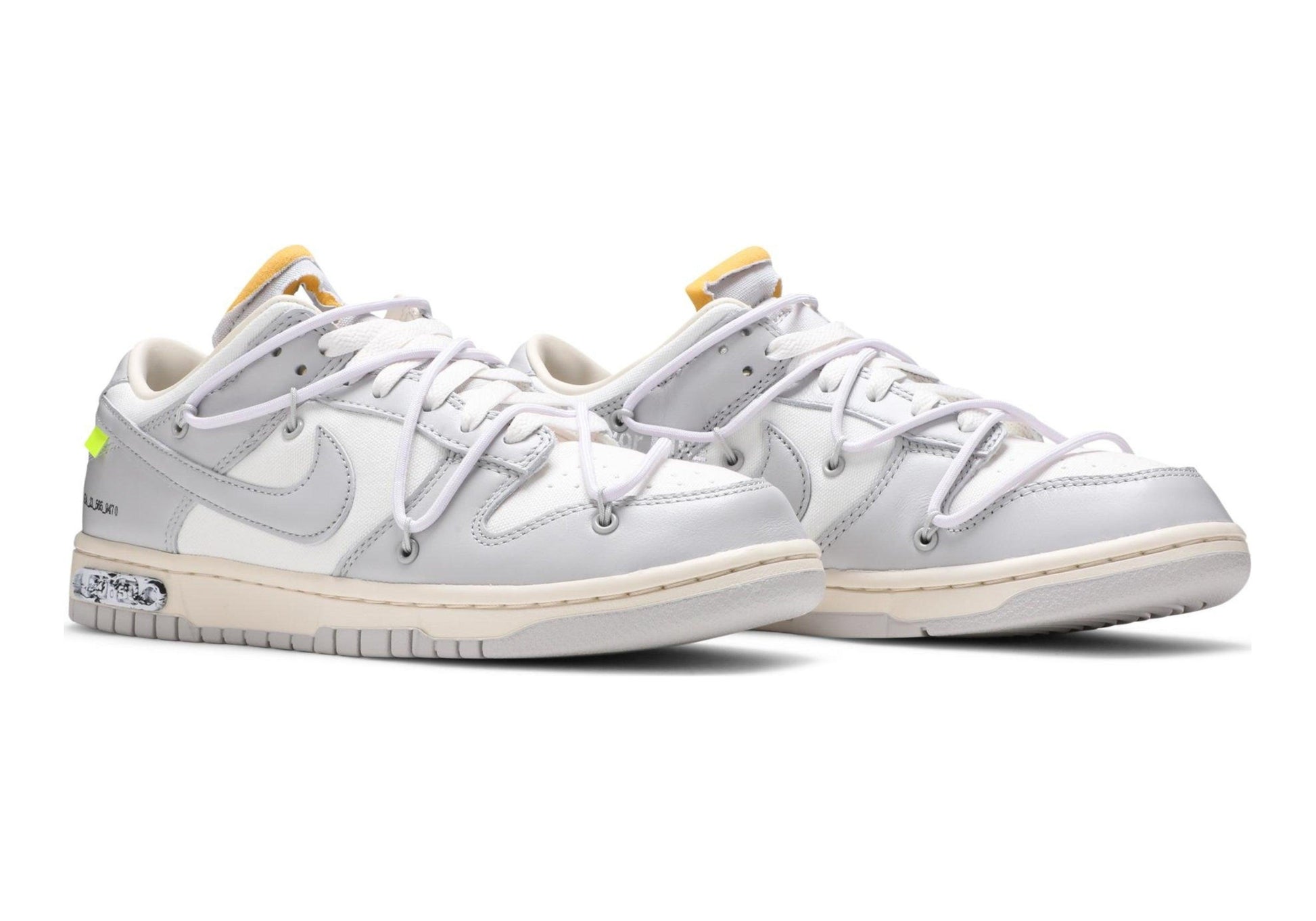 Buy Off-White x Dunk Low 'Lot 49 of 50' in India from copyourdrip.com, This Off-White x Nike Dunk Low is taken from the ‘Dear Summer’ collection, a sprawling follow-up to Virgil Abloh’s first Nike Dunk collaboration from 2019. The low-top makes use of a white leather upper with soft grey canvas overlays, along with Virgil Abloh’s calling-card flourishes, which include a plastic zip tie and printed Helvetica text.